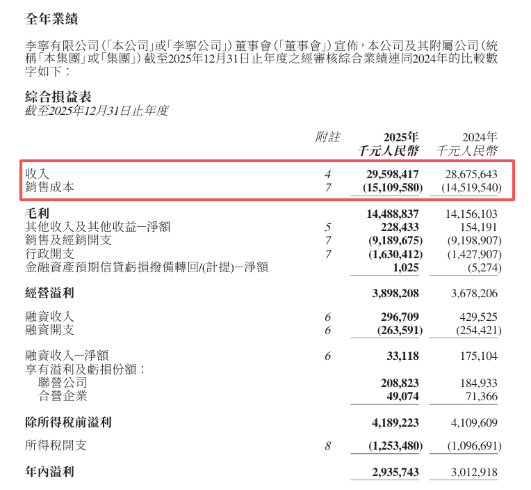 财报显示,2025年李宁总收入达295.98亿元人民币,同比增长3.2%。毛利为144.89亿元,毛利率为49.0%。《节点财经》看来,这一数字说明,专业化战略的推进在一定程度上转化为了定价空间——专业跑鞋或高价球拍的单品利润,确实高于普通运动服装。