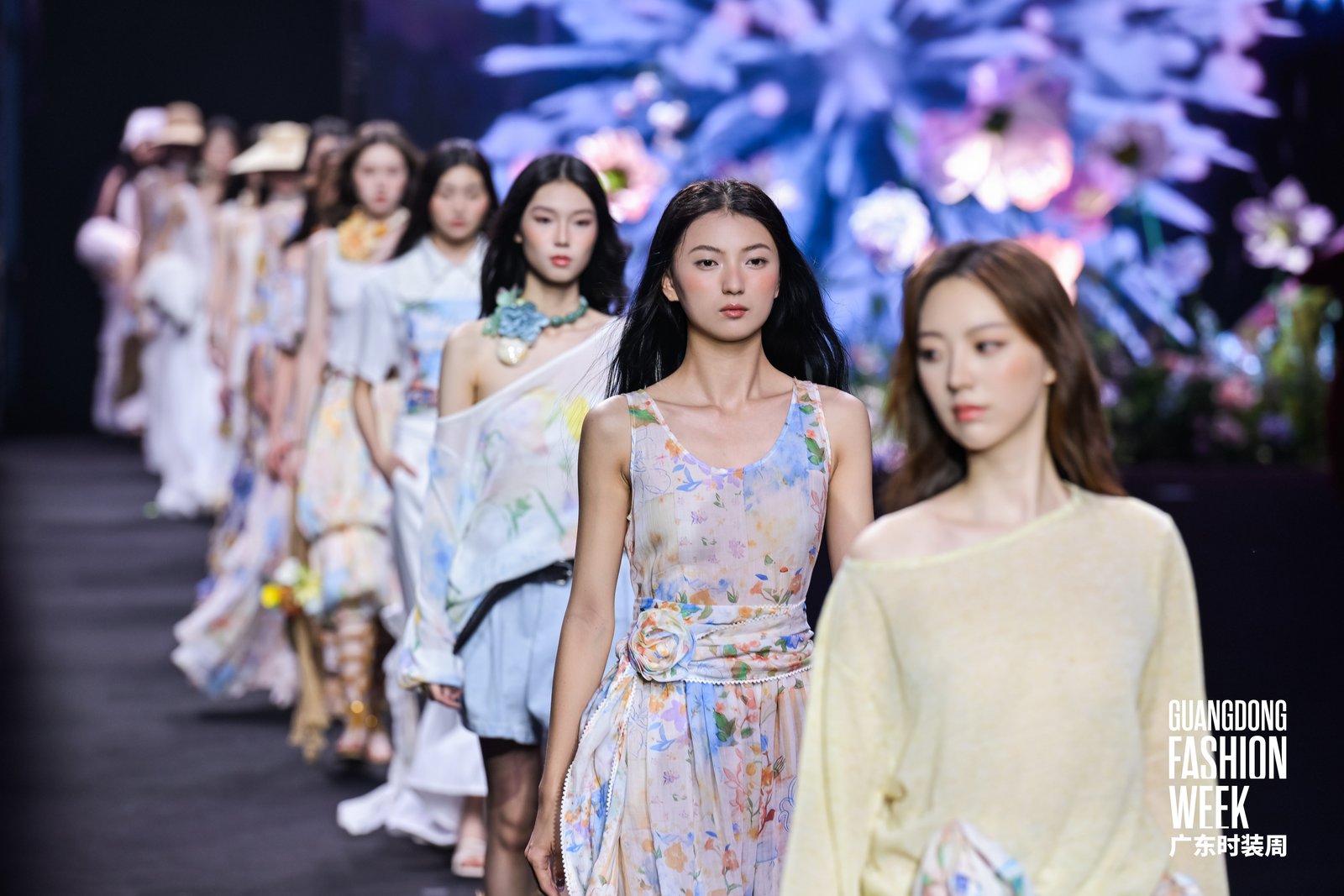 Chloe: 将飘逸薄纱与结构性面料结合,步履间纱质裙摆起伏翻飞,实现了“微透风”特有的二元统一——风感的流动清凉感与布料碰撞的利落线条,精准平衡了优雅与力量。