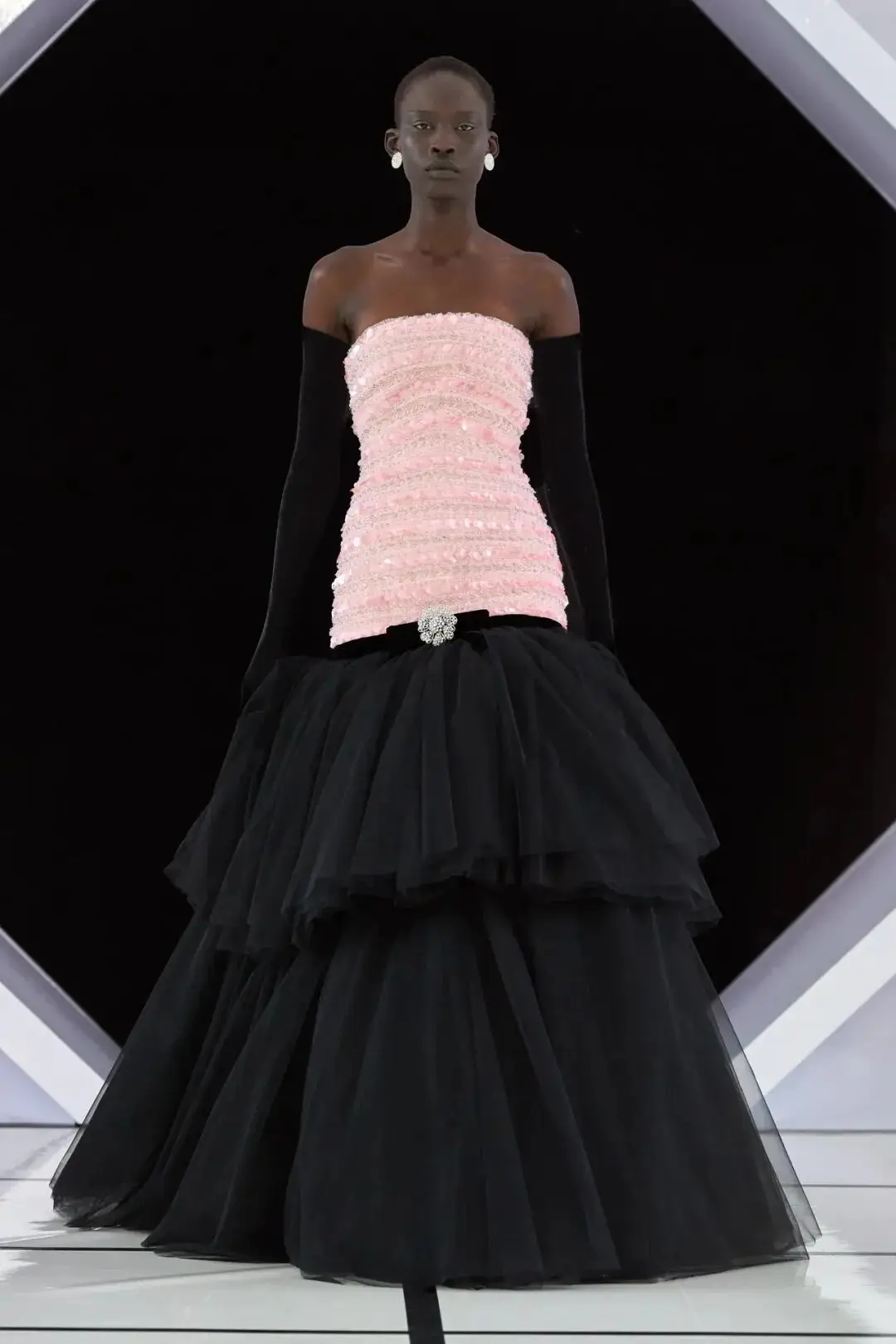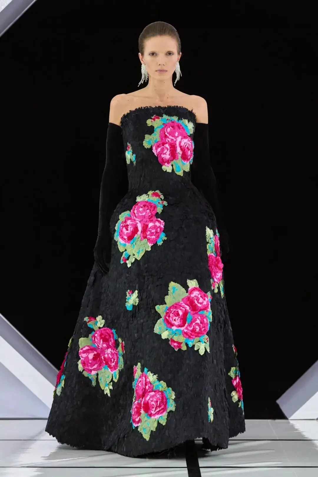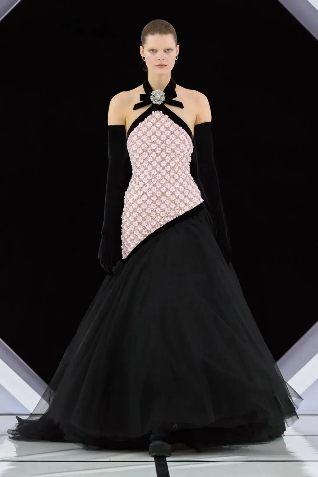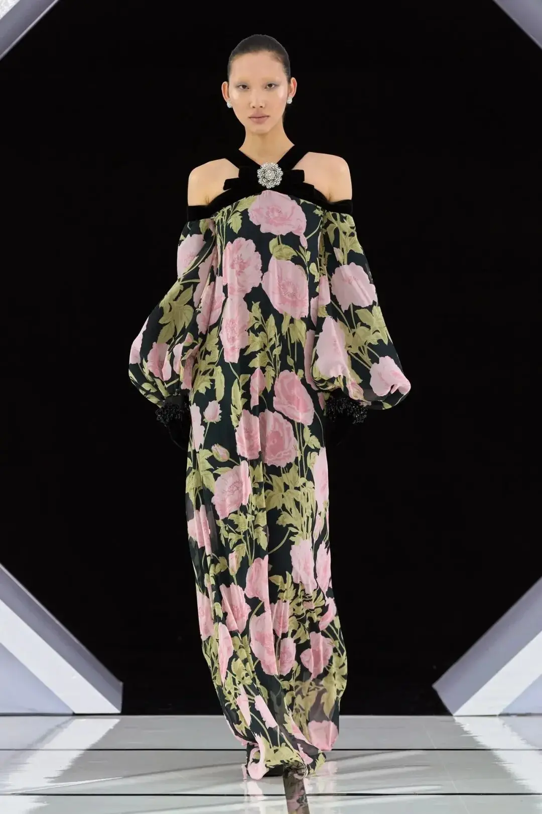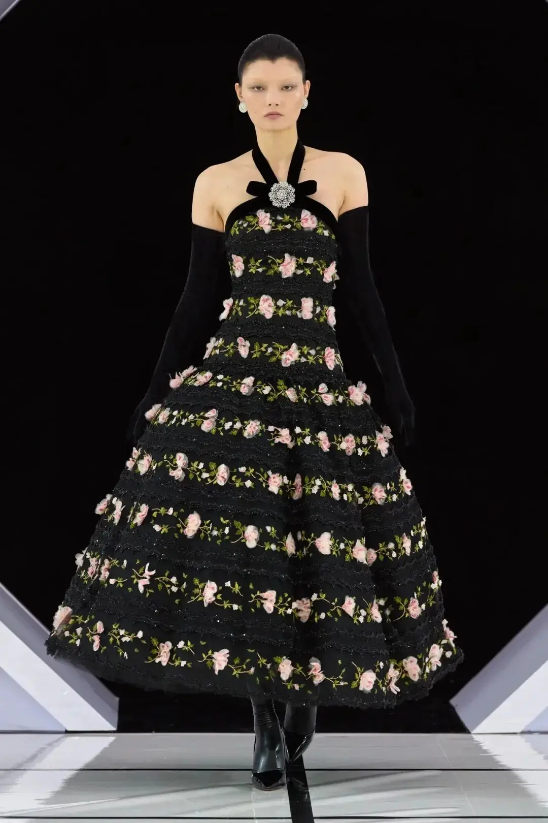 系列以一系列结构精妙的黑白礼服开场,如同古典肖像画的底色,强调着廓形与比例的永恒力量。随后,色彩如被唤醒,跃动而克制的亮红、馥郁的玫粉,以及一系列柔和的粉彩色,依次登场,仿佛描绘着从经典肖像到盛大庆典的叙事脉络。花卉,这一Quinn深入骨髓的执念,化身为更为精湛的工艺:水晶与钻石镶嵌的胸针如露珠般点缀于衣间,细腻的玫瑰与勿忘我花环刺绣,以近乎浮雕的质感,萦绕在巨大的裙撑裙摆与雕塑感的紧身胸衣之上,将浪漫主义情怀提升至奢华定制的高度。