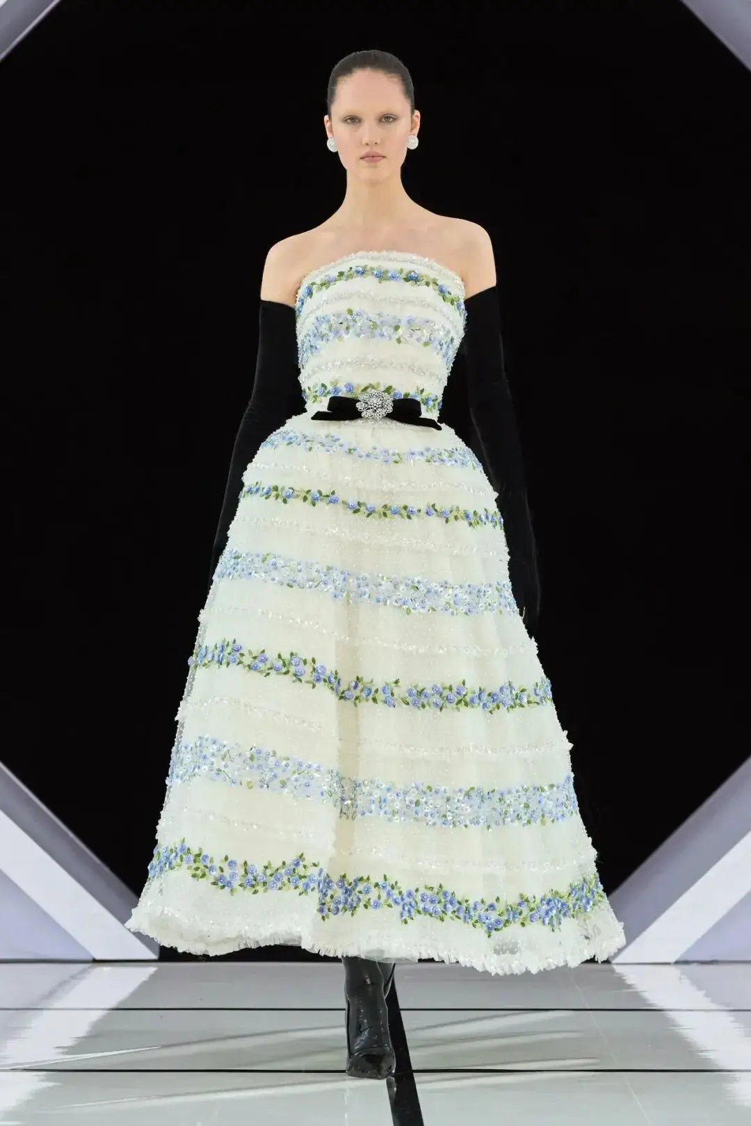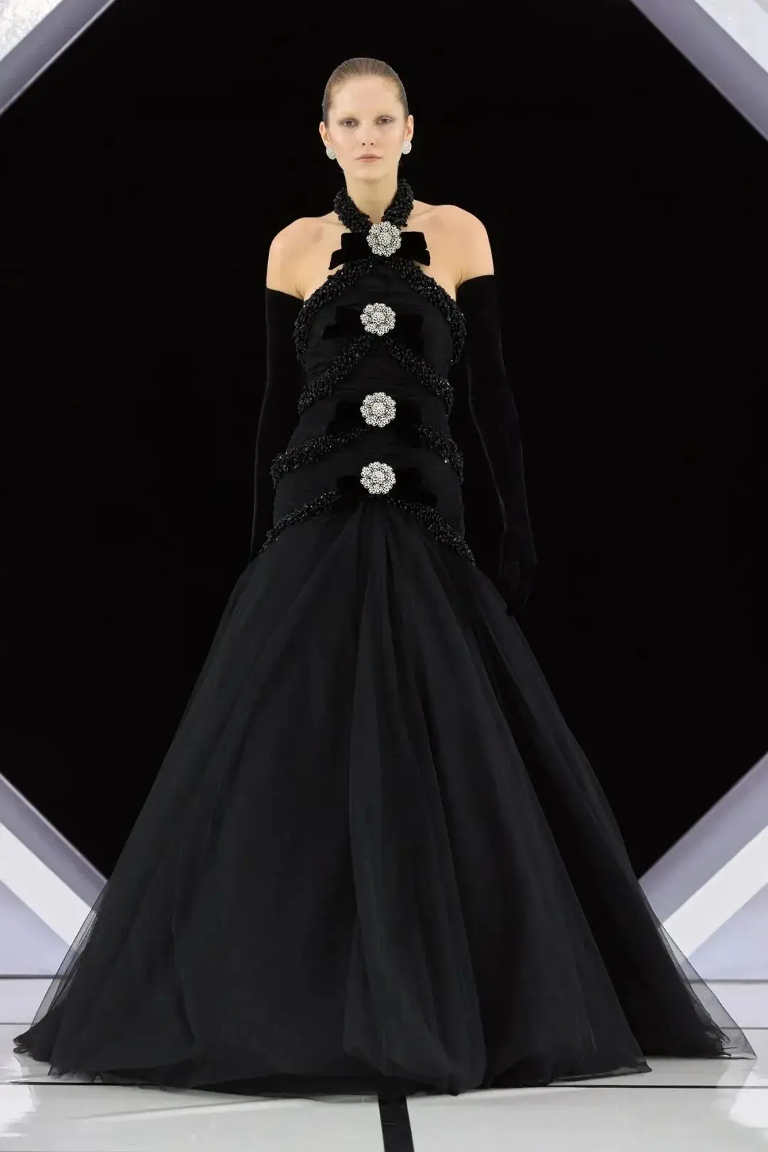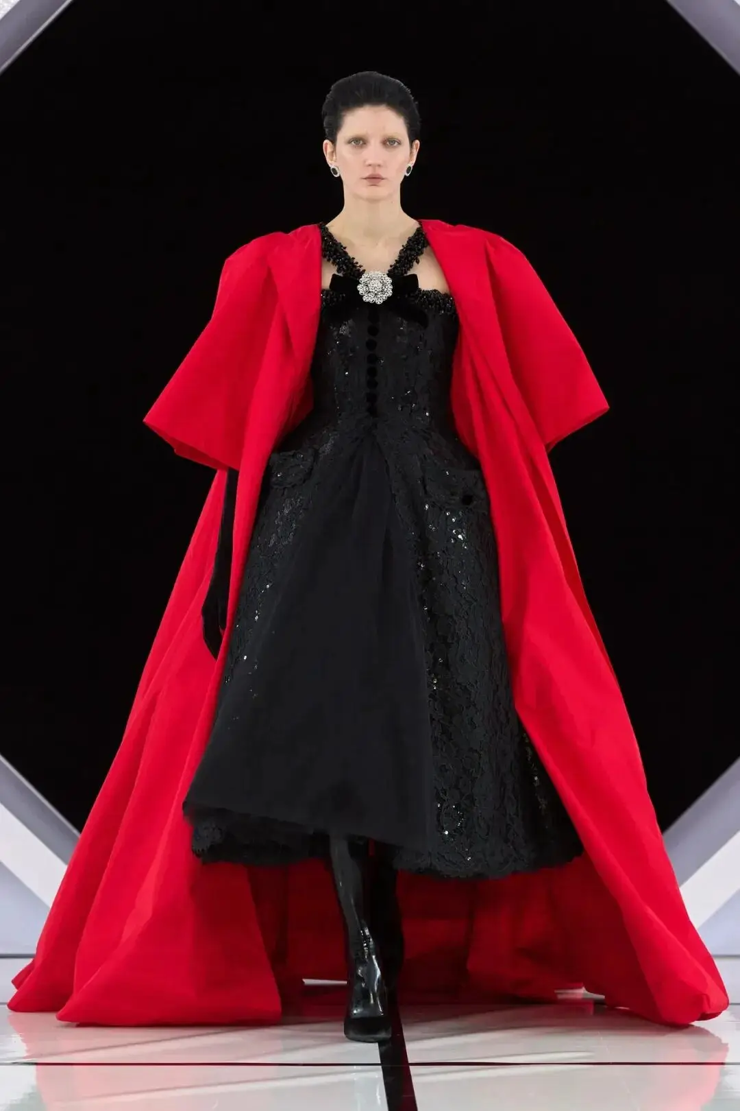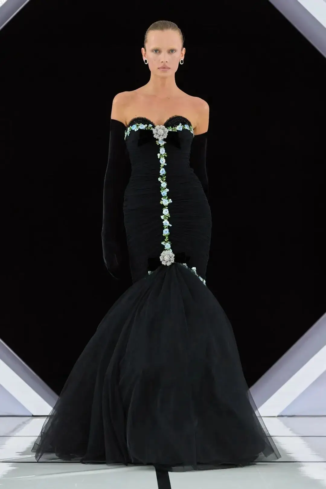 系列以一系列结构精妙的黑白礼服开场,如同古典肖像画的底色,强调着廓形与比例的永恒力量。随后,色彩如被唤醒,跃动而克制的亮红、馥郁的玫粉,以及一系列柔和的粉彩色,依次登场,仿佛描绘着从经典肖像到盛大庆典的叙事脉络。花卉,这一Quinn深入骨髓的执念,化身为更为精湛的工艺:水晶与钻石镶嵌的胸针如露珠般点缀于衣间,细腻的玫瑰与勿忘我花环刺绣,以近乎浮雕的质感,萦绕在巨大的裙撑裙摆与雕塑感的紧身胸衣之上,将浪漫主义情怀提升至奢华定制的高度。