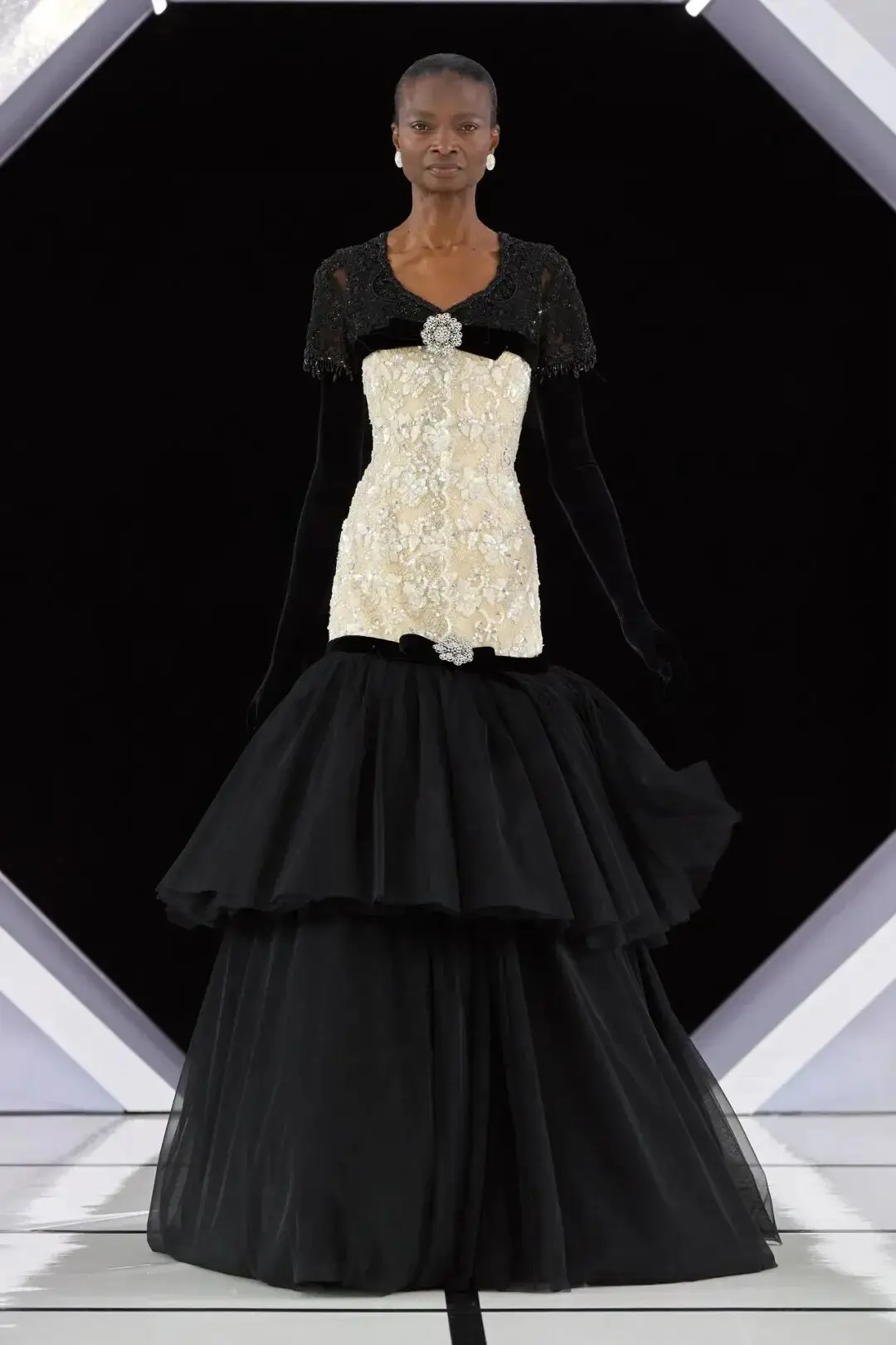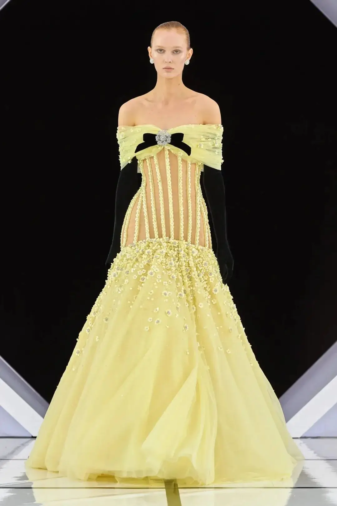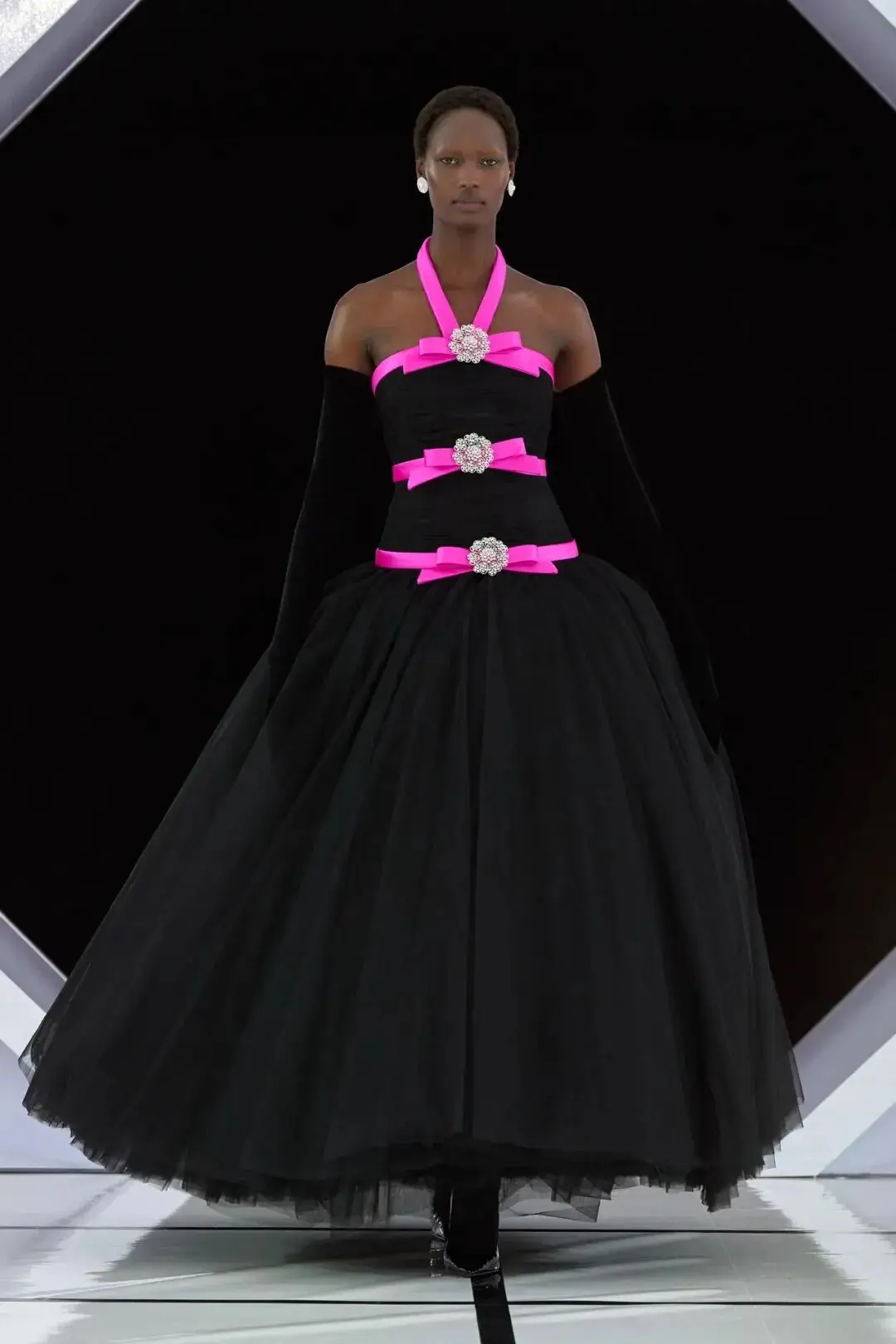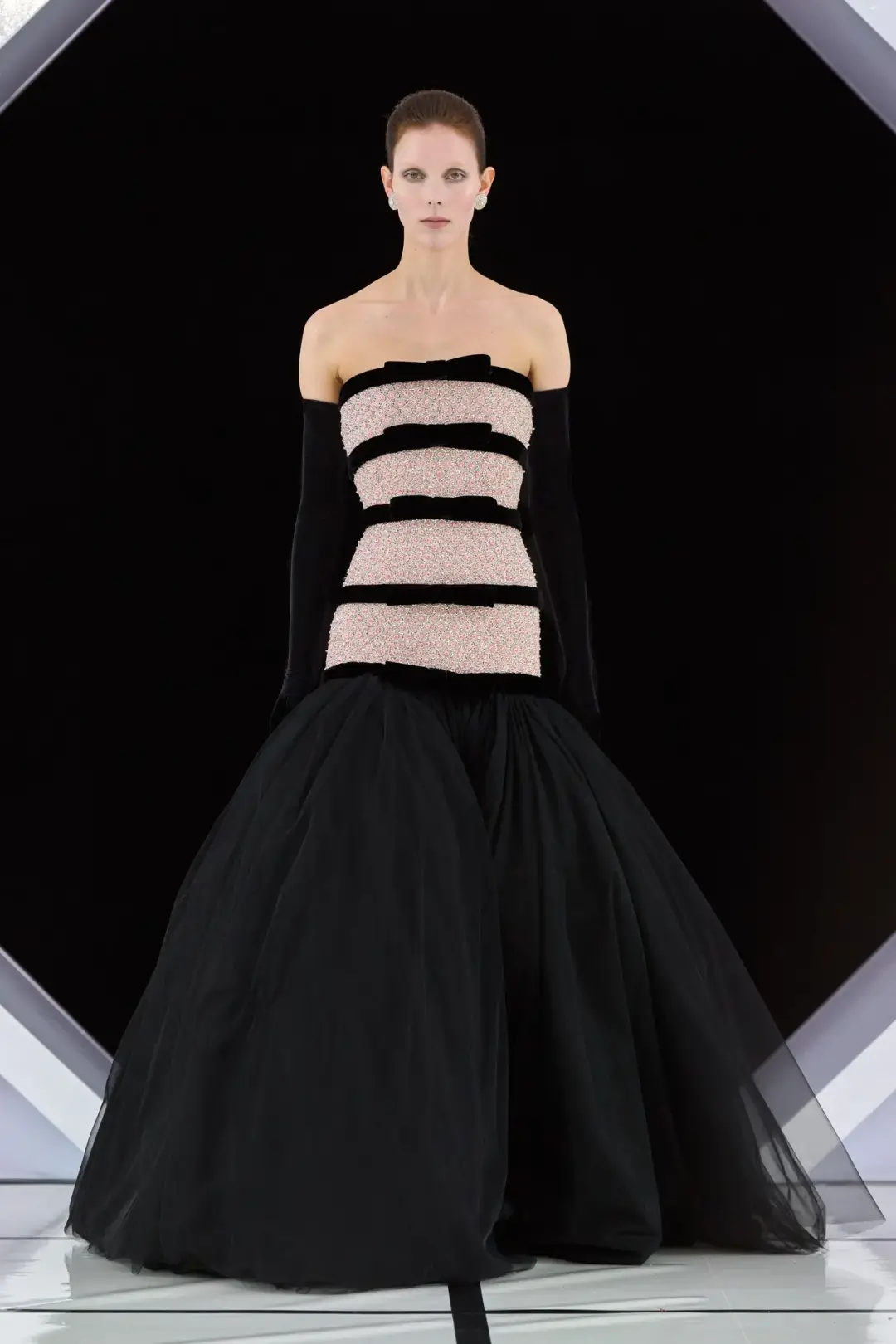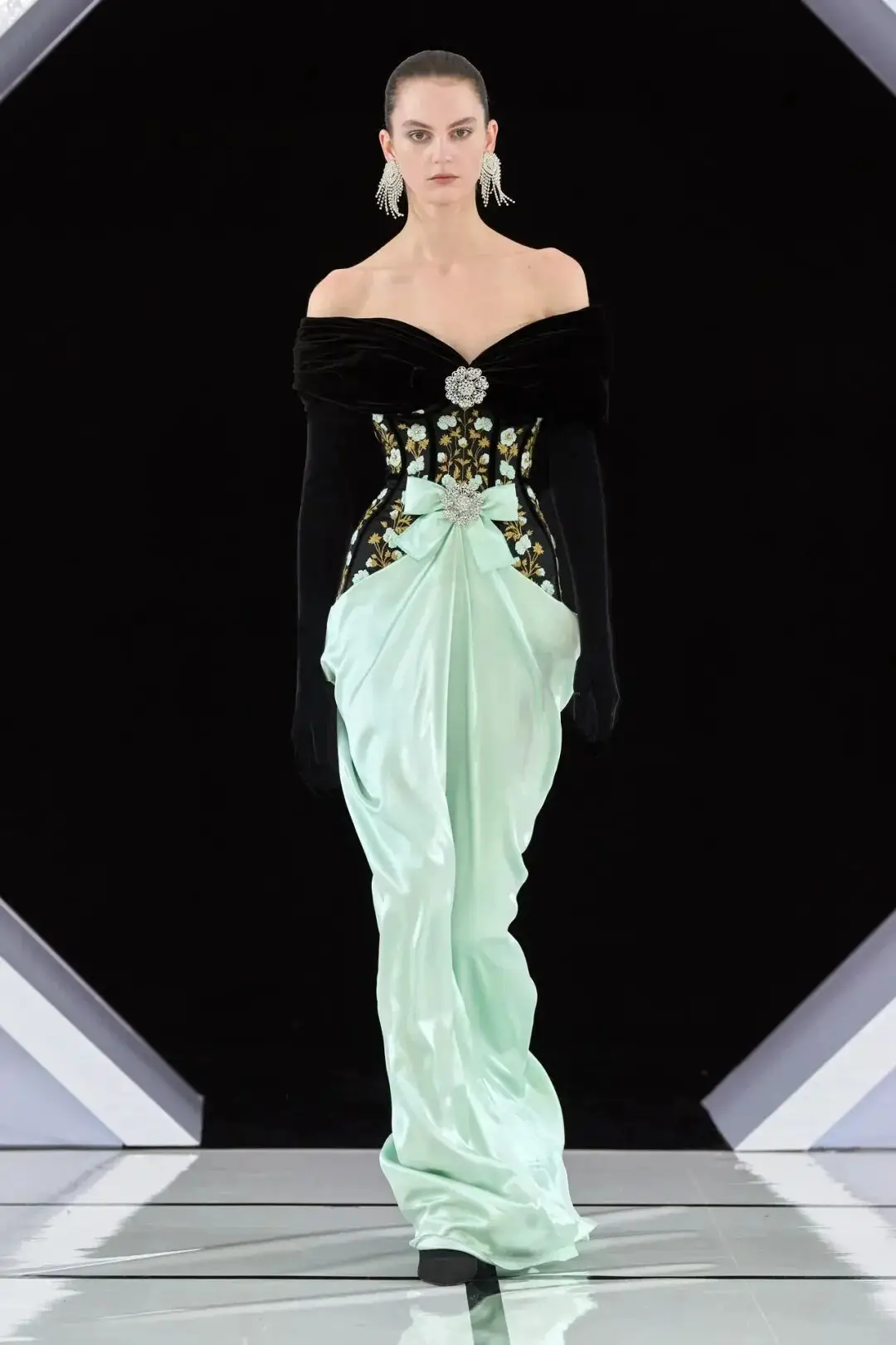 系列以一系列结构精妙的黑白礼服开场,如同古典肖像画的底色,强调着廓形与比例的永恒力量。随后,色彩如被唤醒,跃动而克制的亮红、馥郁的玫粉,以及一系列柔和的粉彩色,依次登场,仿佛描绘着从经典肖像到盛大庆典的叙事脉络。花卉,这一Quinn深入骨髓的执念,化身为更为精湛的工艺:水晶与钻石镶嵌的胸针如露珠般点缀于衣间,细腻的玫瑰与勿忘我花环刺绣,以近乎浮雕的质感,萦绕在巨大的裙撑裙摆与雕塑感的紧身胸衣之上,将浪漫主义情怀提升至奢华定制的高度。