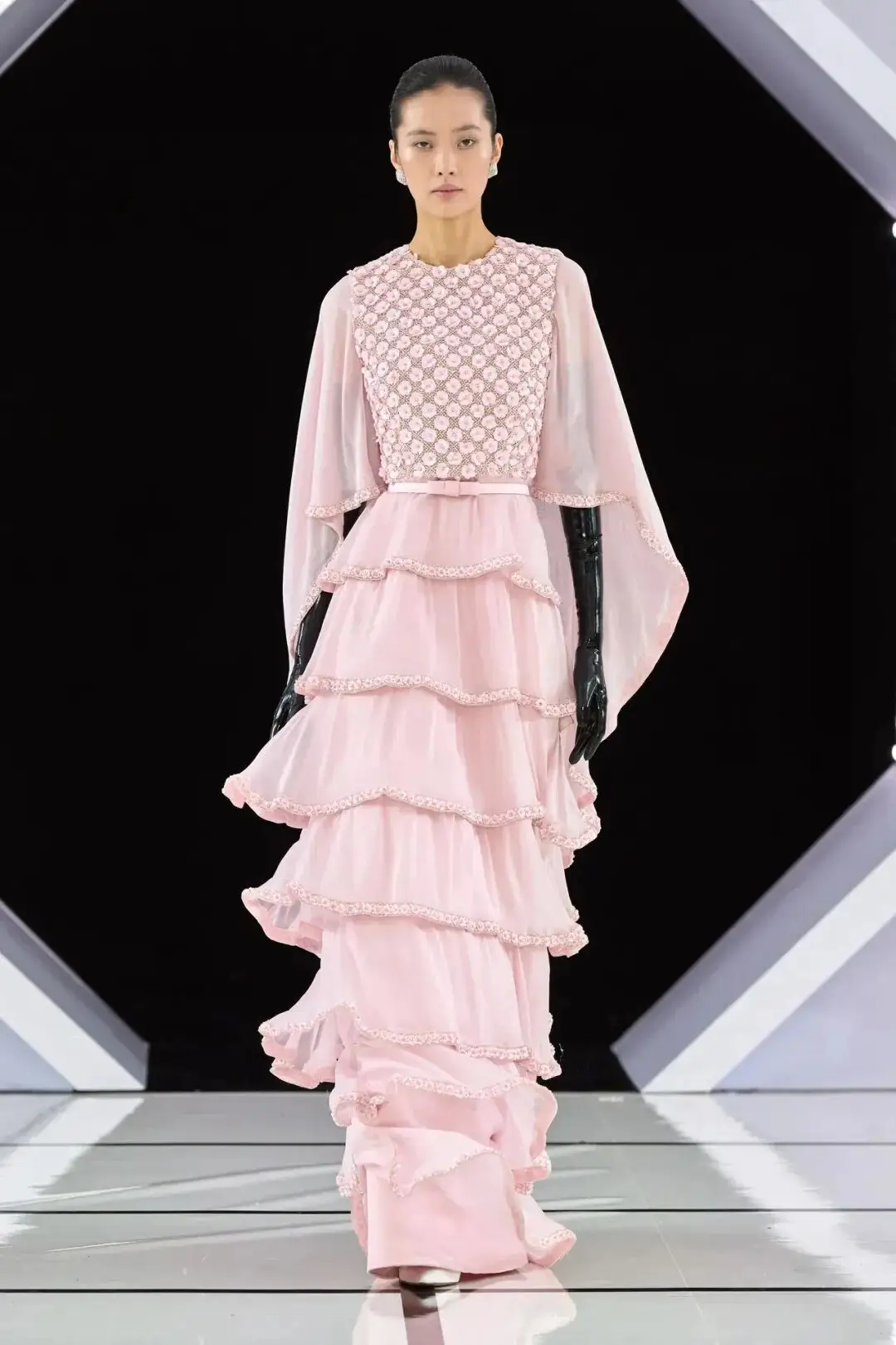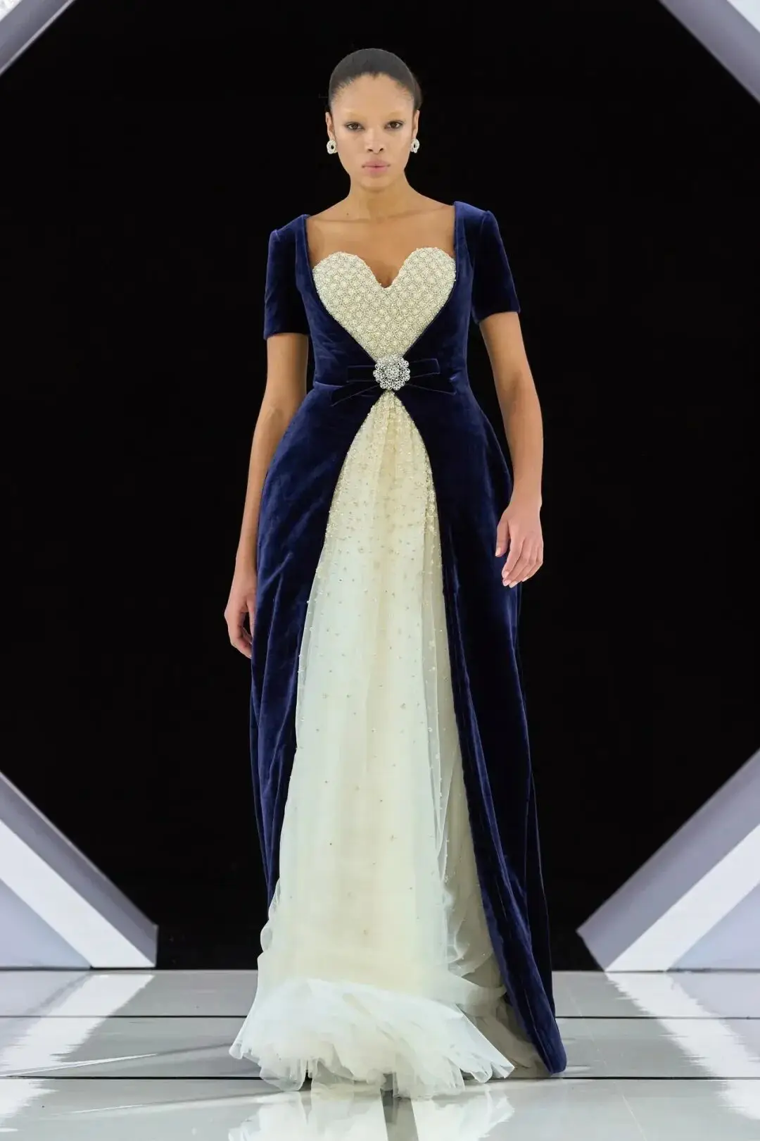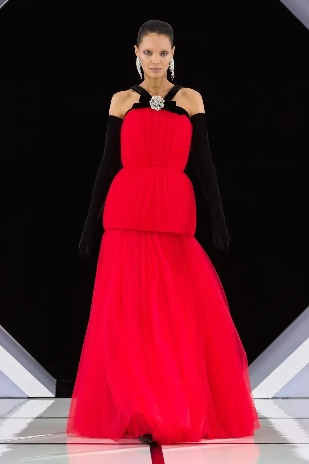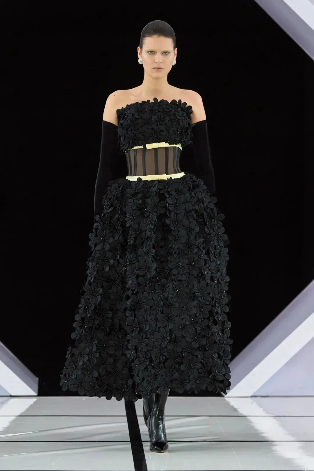 系列以一系列结构精妙的黑白礼服开场,如同古典肖像画的底色,强调着廓形与比例的永恒力量。随后,色彩如被唤醒,跃动而克制的亮红、馥郁的玫粉,以及一系列柔和的粉彩色,依次登场,仿佛描绘着从经典肖像到盛大庆典的叙事脉络。花卉,这一Quinn深入骨髓的执念,化身为更为精湛的工艺:水晶与钻石镶嵌的胸针如露珠般点缀于衣间,细腻的玫瑰与勿忘我花环刺绣,以近乎浮雕的质感,萦绕在巨大的裙撑裙摆与雕塑感的紧身胸衣之上,将浪漫主义情怀提升至奢华定制的高度。