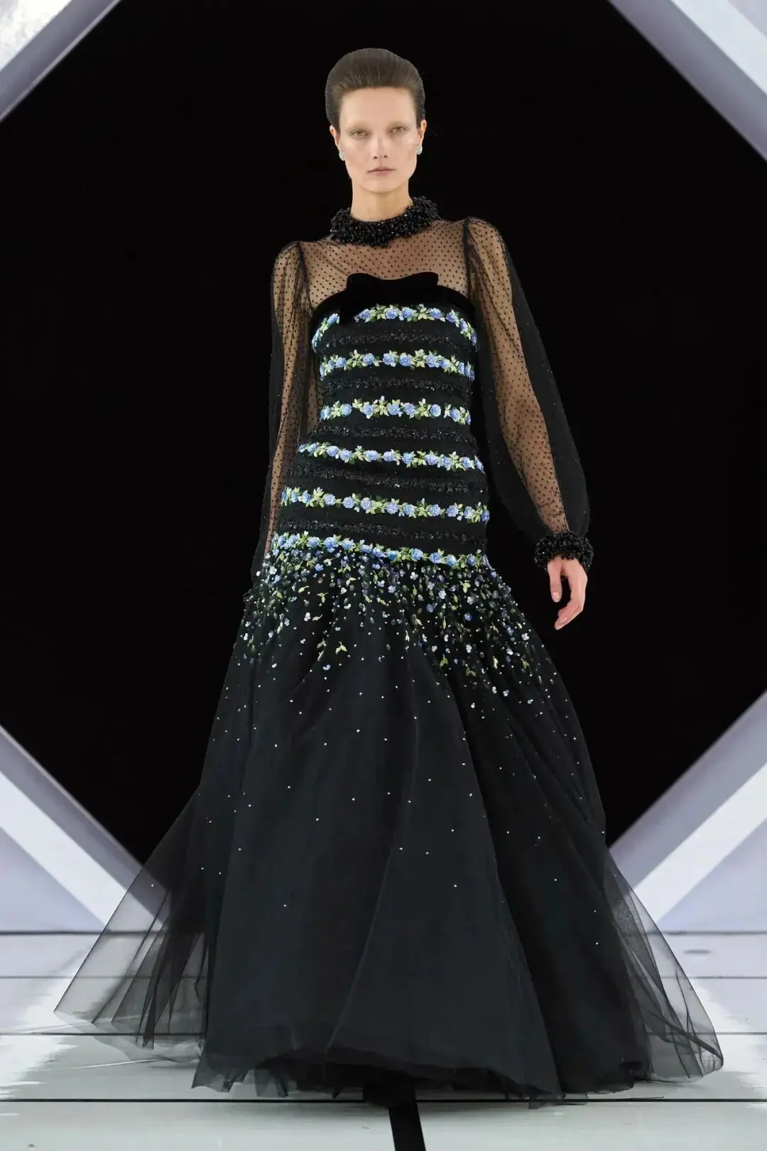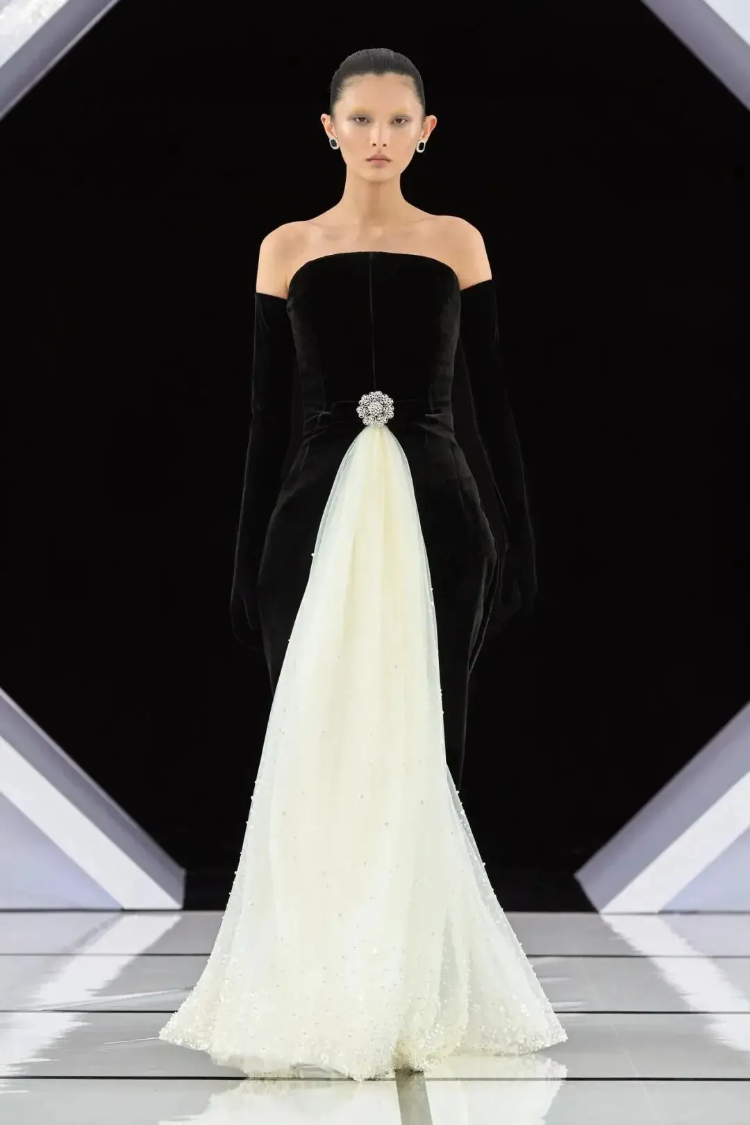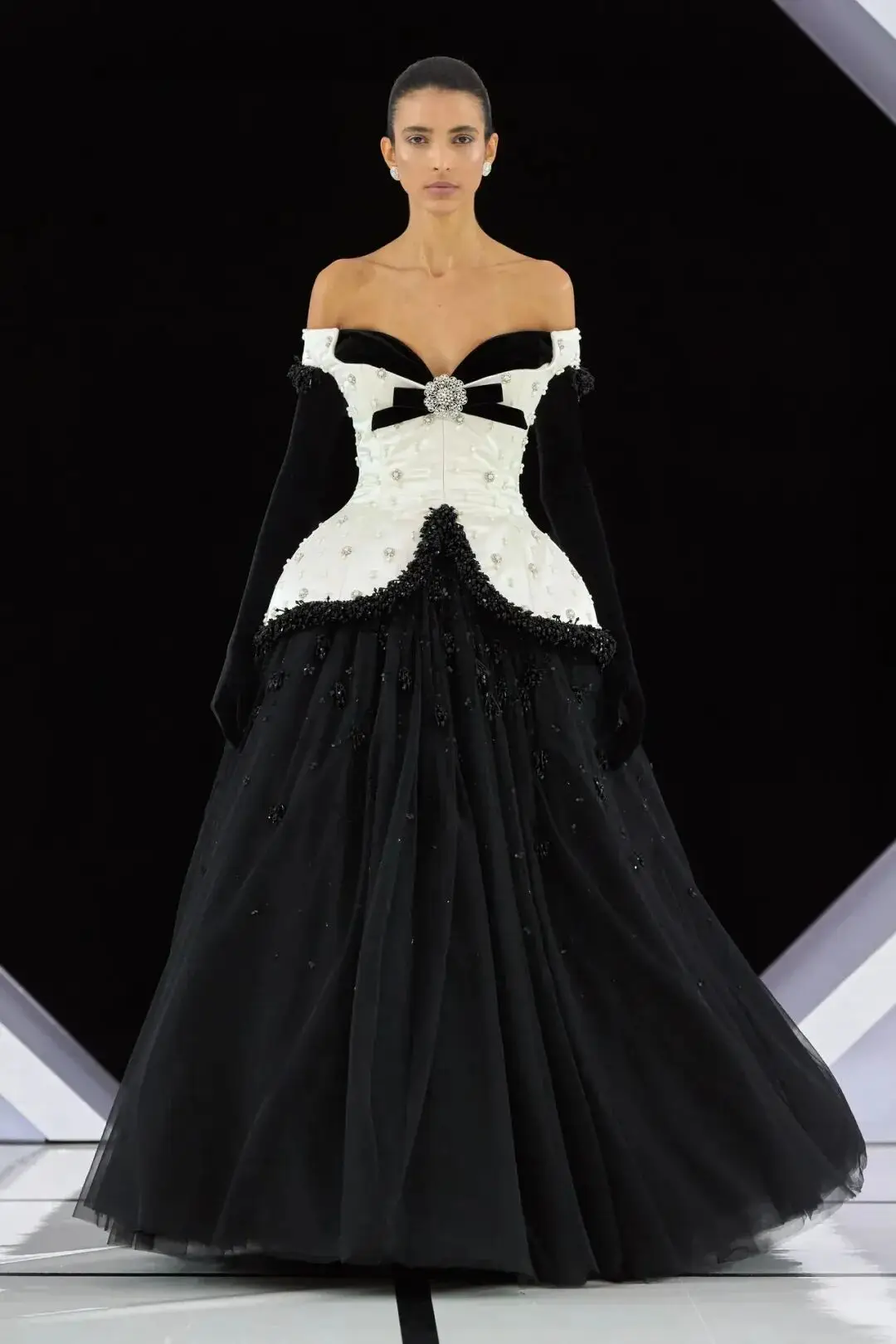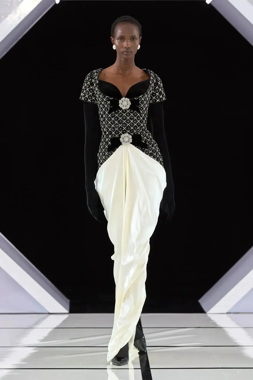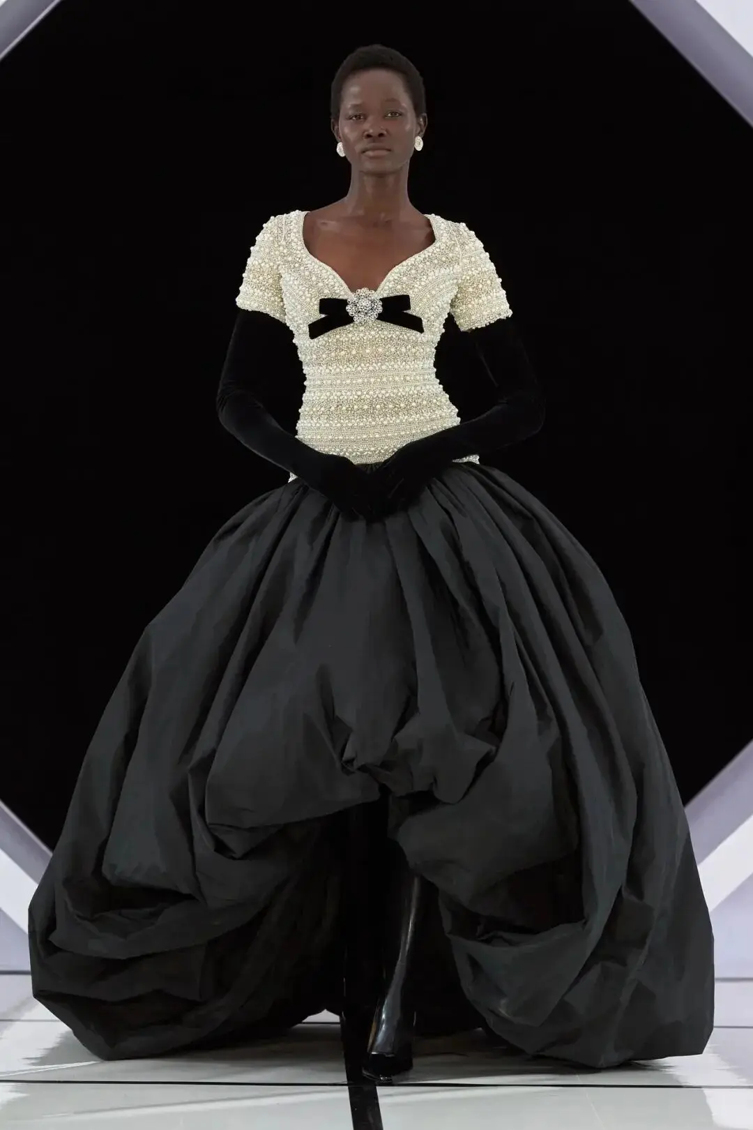 系列以一系列结构精妙的黑白礼服开场,如同古典肖像画的底色,强调着廓形与比例的永恒力量。随后,色彩如被唤醒,跃动而克制的亮红、馥郁的玫粉,以及一系列柔和的粉彩色,依次登场,仿佛描绘着从经典肖像到盛大庆典的叙事脉络。花卉,这一Quinn深入骨髓的执念,化身为更为精湛的工艺:水晶与钻石镶嵌的胸针如露珠般点缀于衣间,细腻的玫瑰与勿忘我花环刺绣,以近乎浮雕的质感,萦绕在巨大的裙撑裙摆与雕塑感的紧身胸衣之上,将浪漫主义情怀提升至奢华定制的高度。
