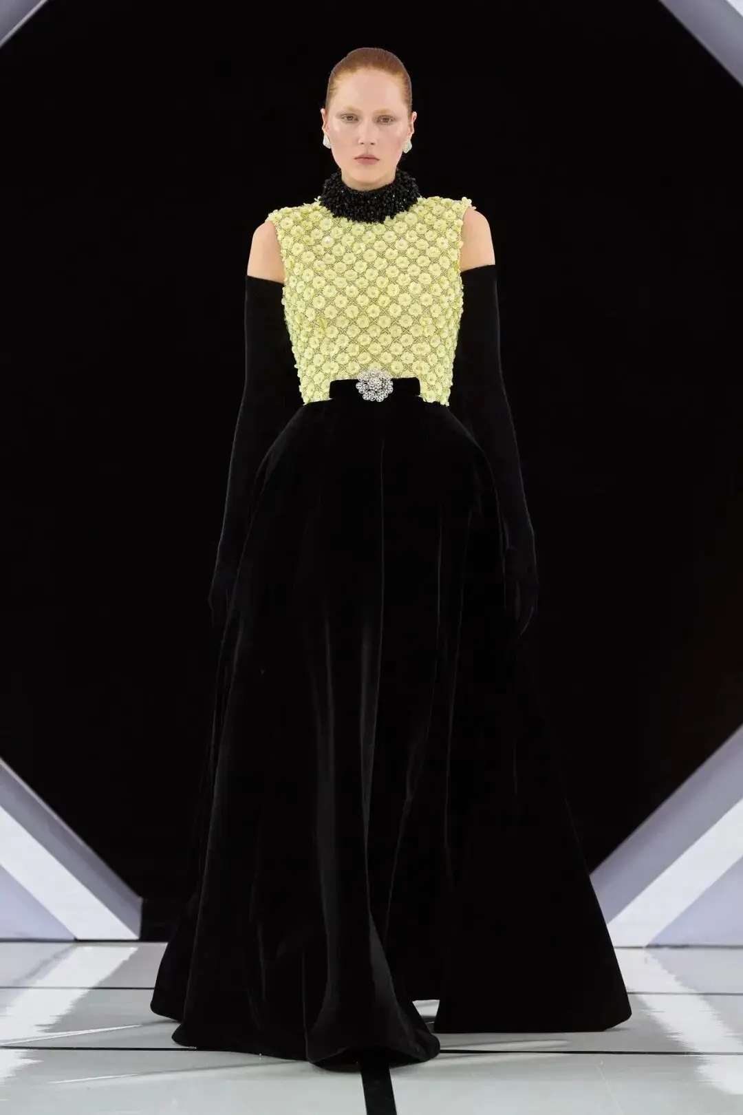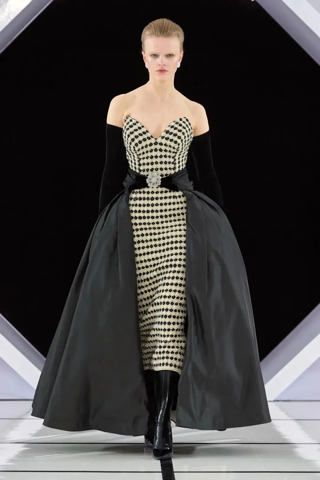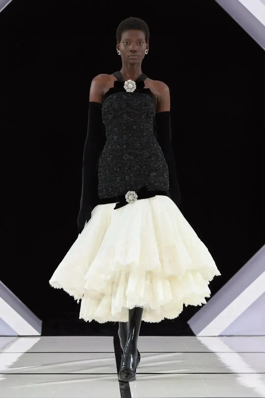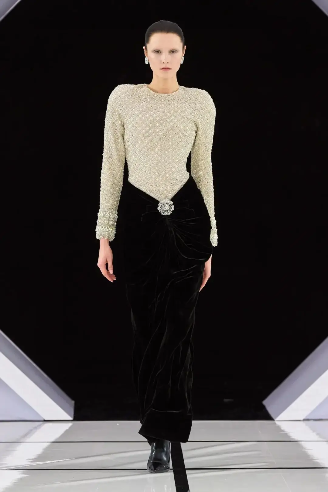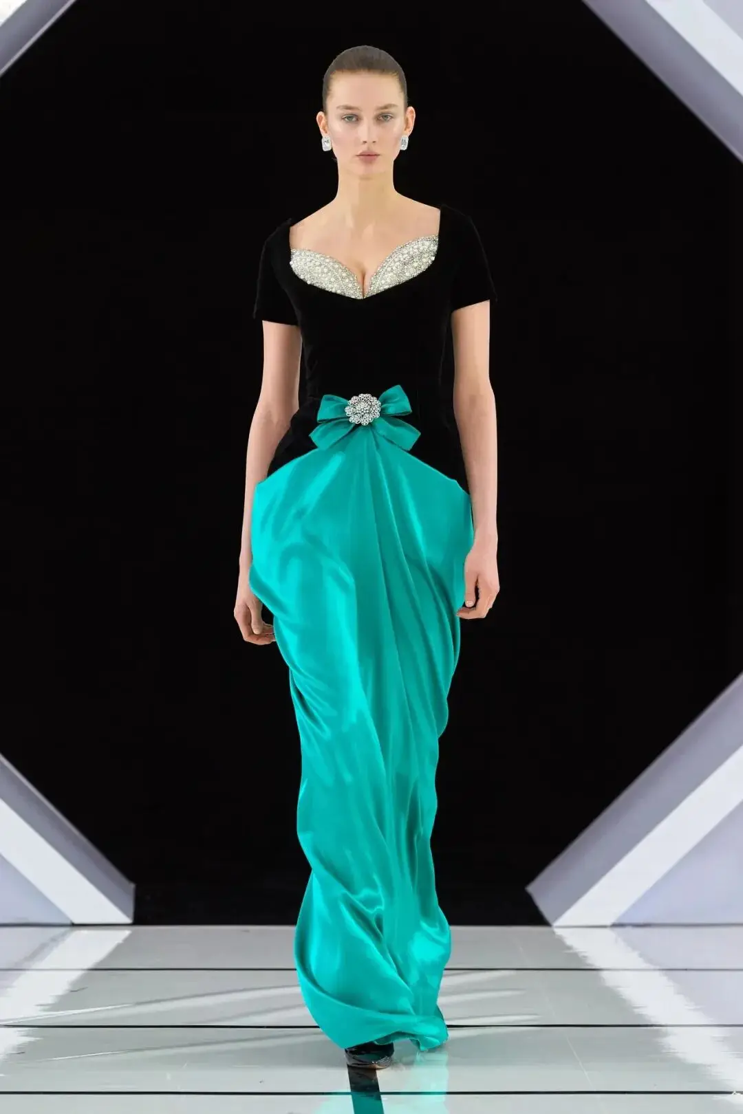 系列以一系列结构精妙的黑白礼服开场,如同古典肖像画的底色,强调着廓形与比例的永恒力量。随后,色彩如被唤醒,跃动而克制的亮红、馥郁的玫粉,以及一系列柔和的粉彩色,依次登场,仿佛描绘着从经典肖像到盛大庆典的叙事脉络。花卉,这一Quinn深入骨髓的执念,化身为更为精湛的工艺:水晶与钻石镶嵌的胸针如露珠般点缀于衣间,细腻的玫瑰与勿忘我花环刺绣,以近乎浮雕的质感,萦绕在巨大的裙撑裙摆与雕塑感的紧身胸衣之上,将浪漫主义情怀提升至奢华定制的高度。