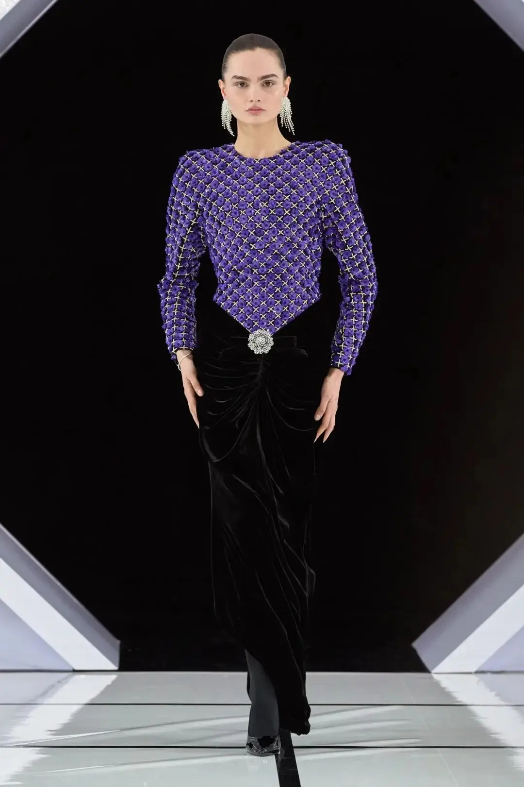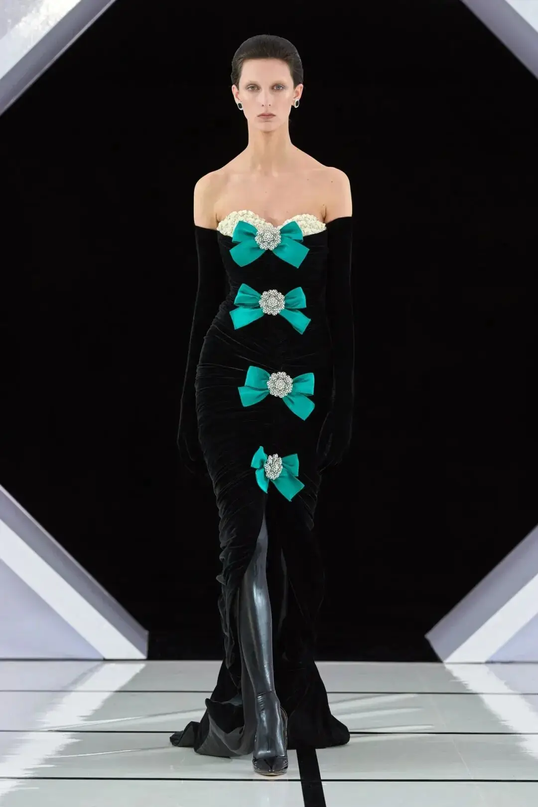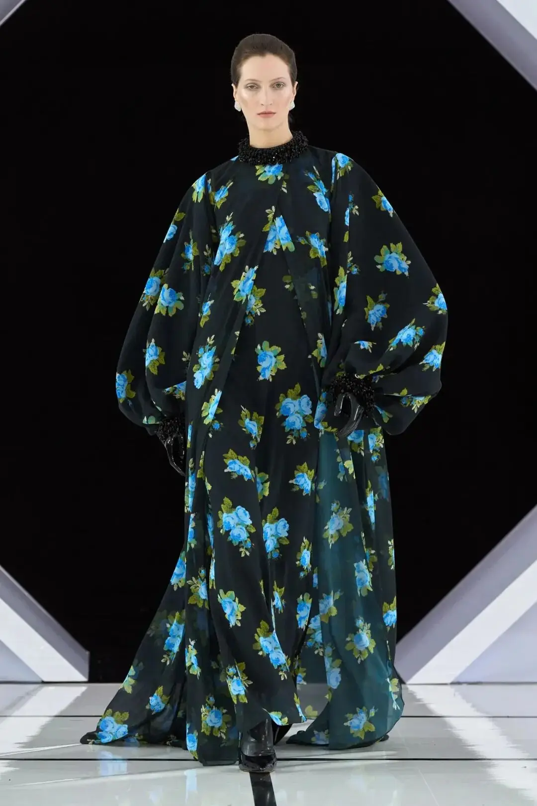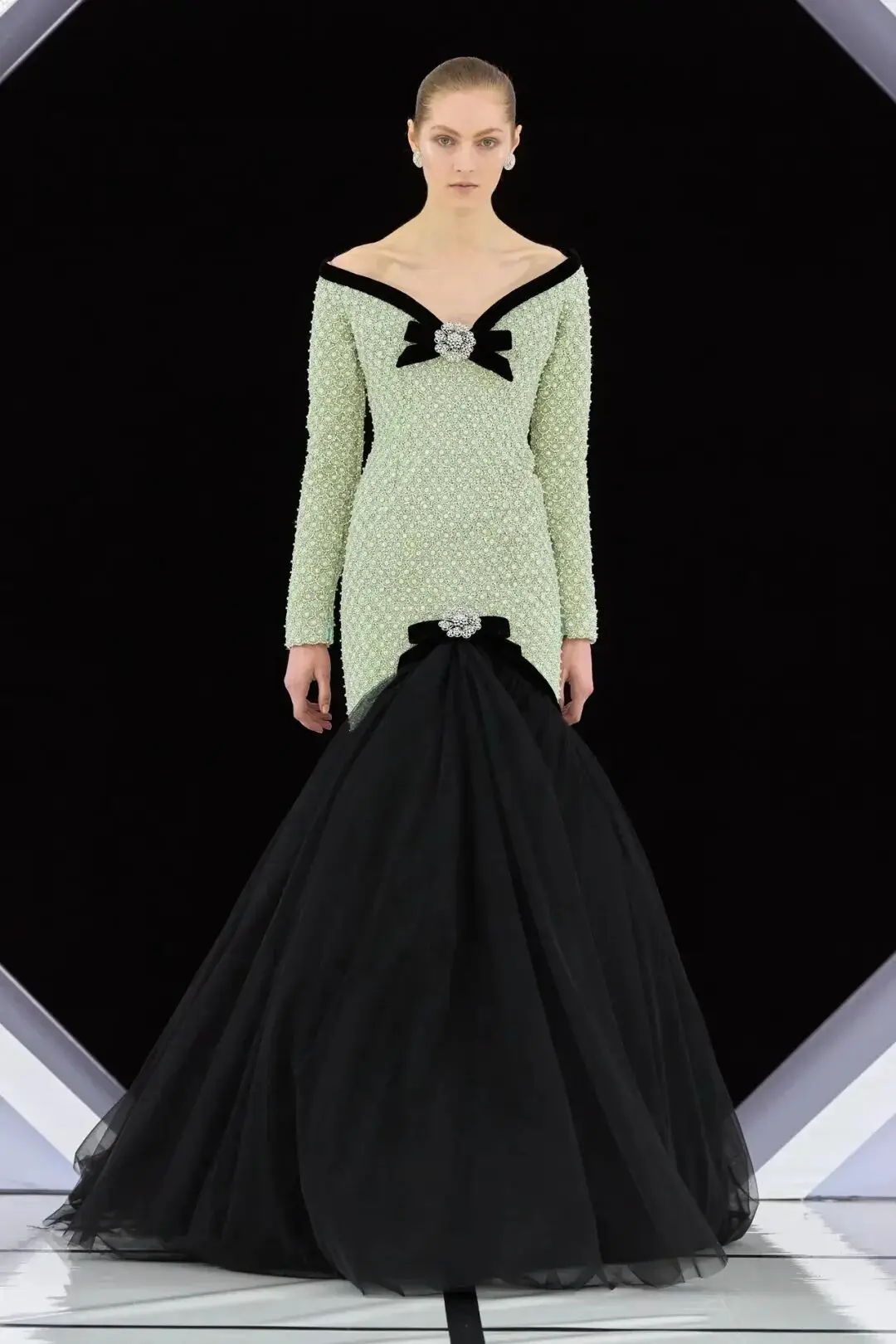 系列以一系列结构精妙的黑白礼服开场,如同古典肖像画的底色,强调着廓形与比例的永恒力量。随后,色彩如被唤醒,跃动而克制的亮红、馥郁的玫粉,以及一系列柔和的粉彩色,依次登场,仿佛描绘着从经典肖像到盛大庆典的叙事脉络。花卉,这一Quinn深入骨髓的执念,化身为更为精湛的工艺:水晶与钻石镶嵌的胸针如露珠般点缀于衣间,细腻的玫瑰与勿忘我花环刺绣,以近乎浮雕的质感,萦绕在巨大的裙撑裙摆与雕塑感的紧身胸衣之上,将浪漫主义情怀提升至奢华定制的高度。