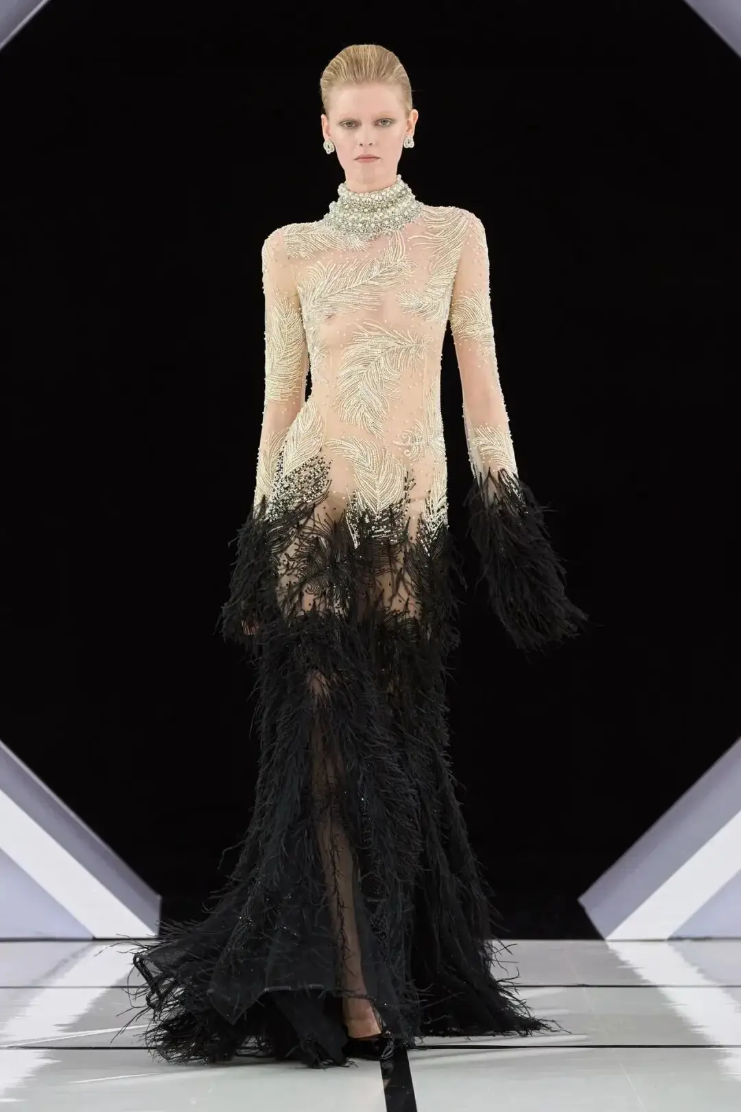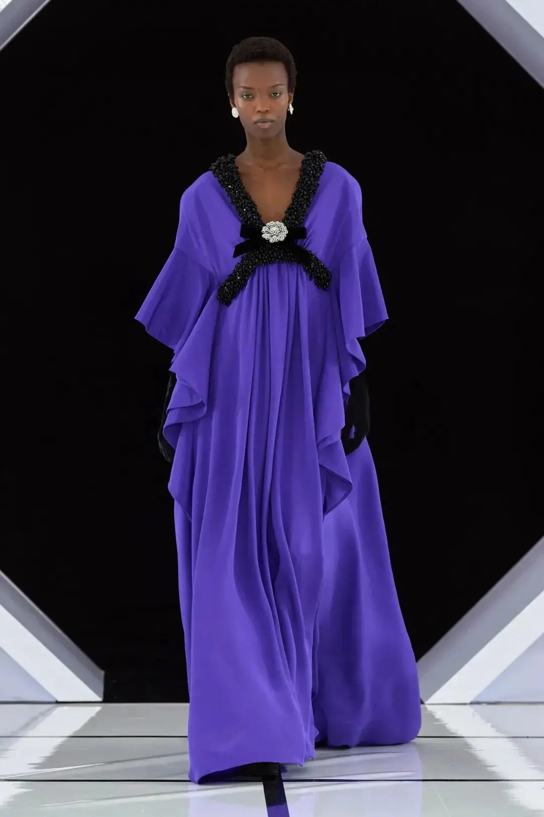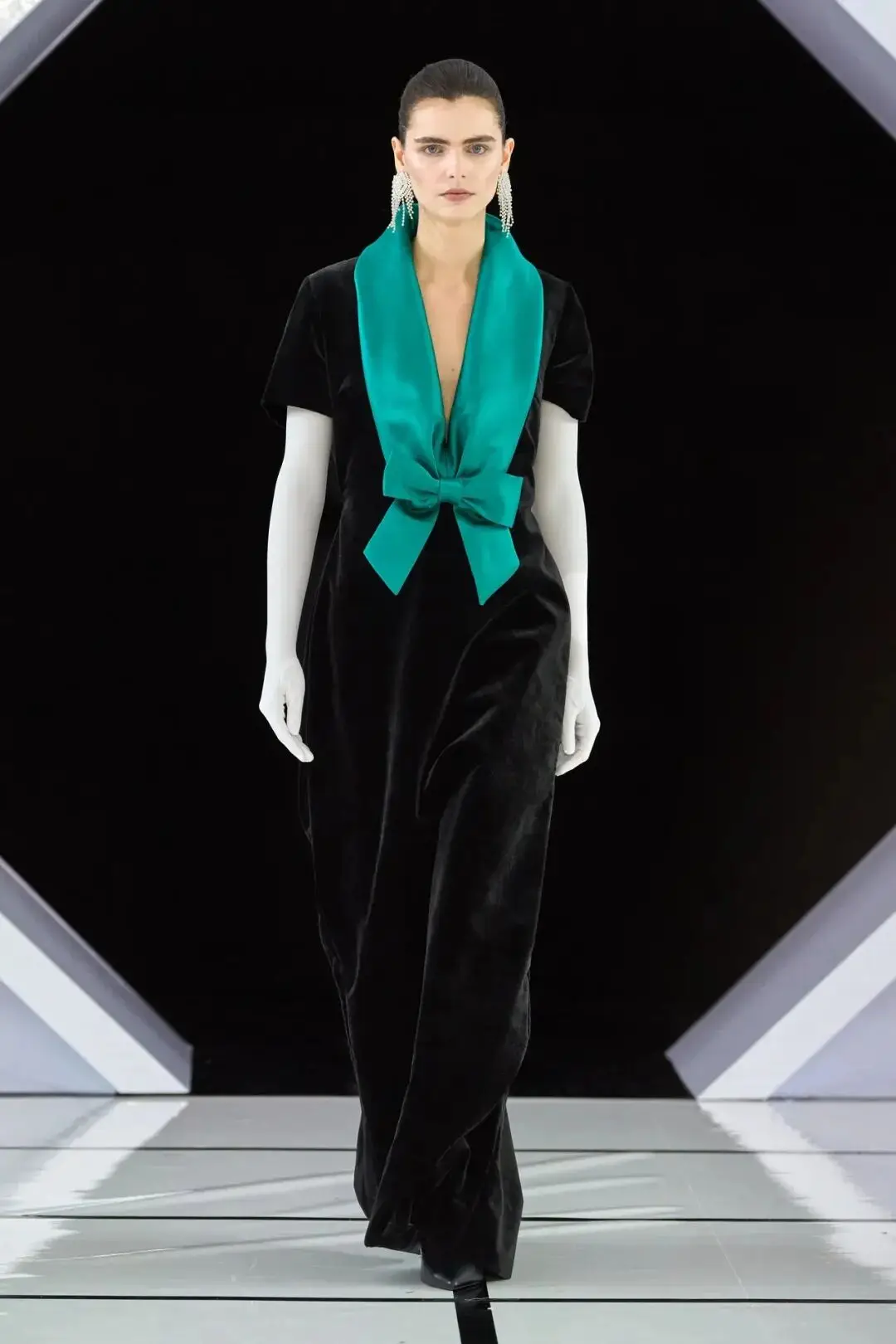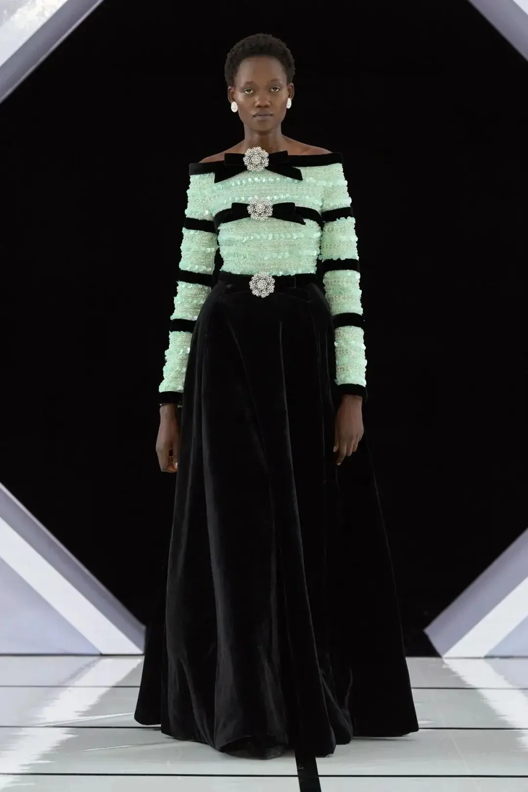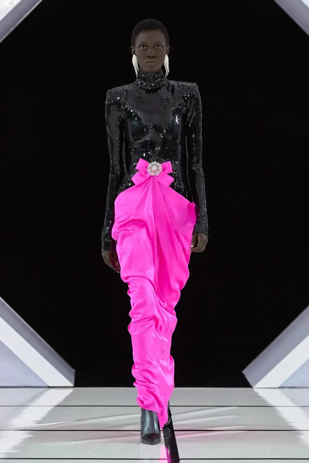 系列以一系列结构精妙的黑白礼服开场,如同古典肖像画的底色,强调着廓形与比例的永恒力量。随后,色彩如被唤醒,跃动而克制的亮红、馥郁的玫粉,以及一系列柔和的粉彩色,依次登场,仿佛描绘着从经典肖像到盛大庆典的叙事脉络。花卉,这一Quinn深入骨髓的执念,化身为更为精湛的工艺:水晶与钻石镶嵌的胸针如露珠般点缀于衣间,细腻的玫瑰与勿忘我花环刺绣,以近乎浮雕的质感,萦绕在巨大的裙撑裙摆与雕塑感的紧身胸衣之上,将浪漫主义情怀提升至奢华定制的高度。