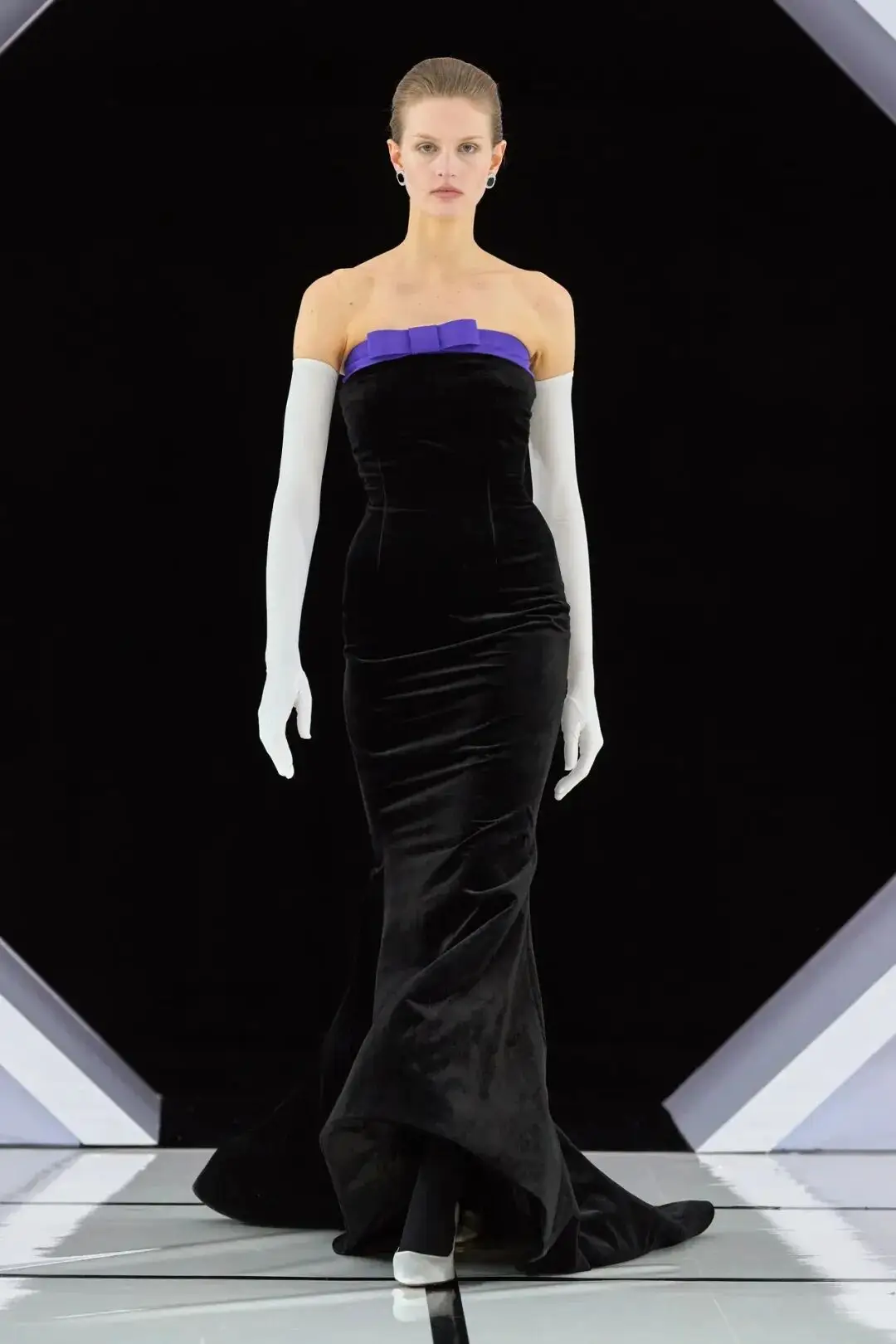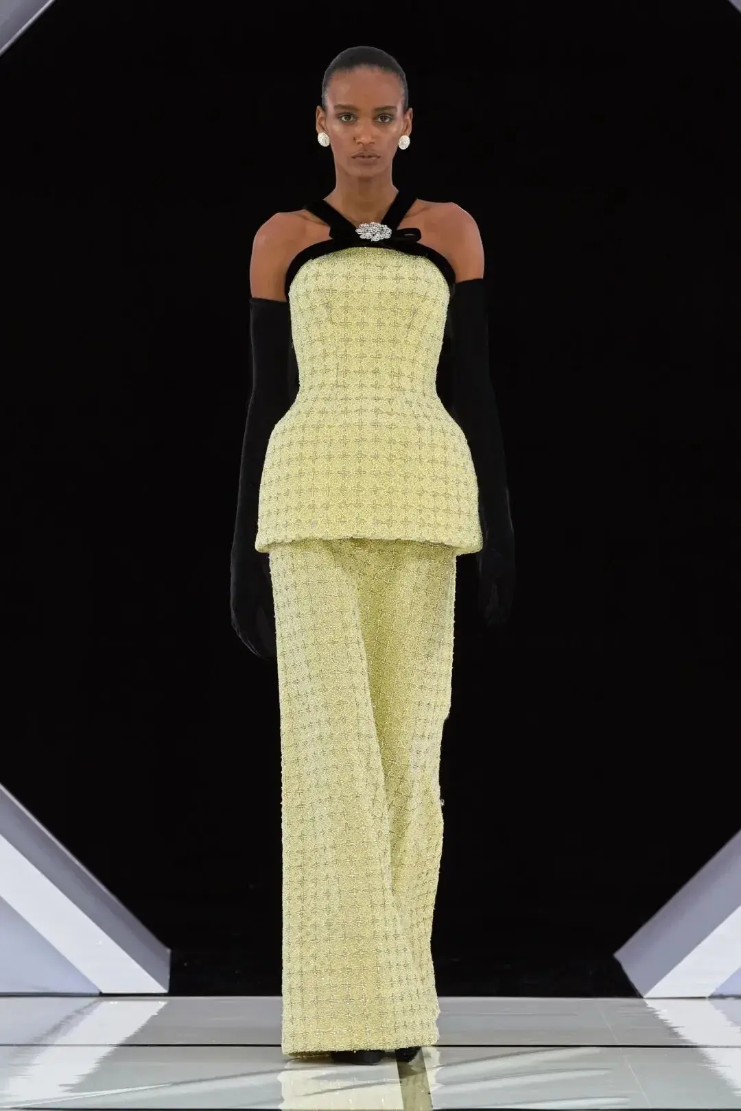 廓形上,Quinn宛如一位穿梭时光的剪裁师,精准复刻并重新诠释了上世纪50年代至80年代高级定制服的华彩片段——从迪奥“新风貌”(New Look)的沙漏腰线,到80年代舞会礼服的磅礴气势,其间流淌着旧日好莱坞的奢华幻梦。然而,这一切并非仅止于T台的幻影。Quinn商业模式的基石,正扎根于南伦敦其个人工坊的务实土壤中。品牌反复强调并践行“秀场即卖场”的承诺,每一件展示作品皆可接受定制与修改,真正将高级定制的私密性与专属性融入现代商业模式。这系列礼服,旨在成为陪伴女性穿梭于重要晚宴、慈善盛会、皇室典礼的“战袍”,是能承载记忆、代代相传的衣橱珍宝。