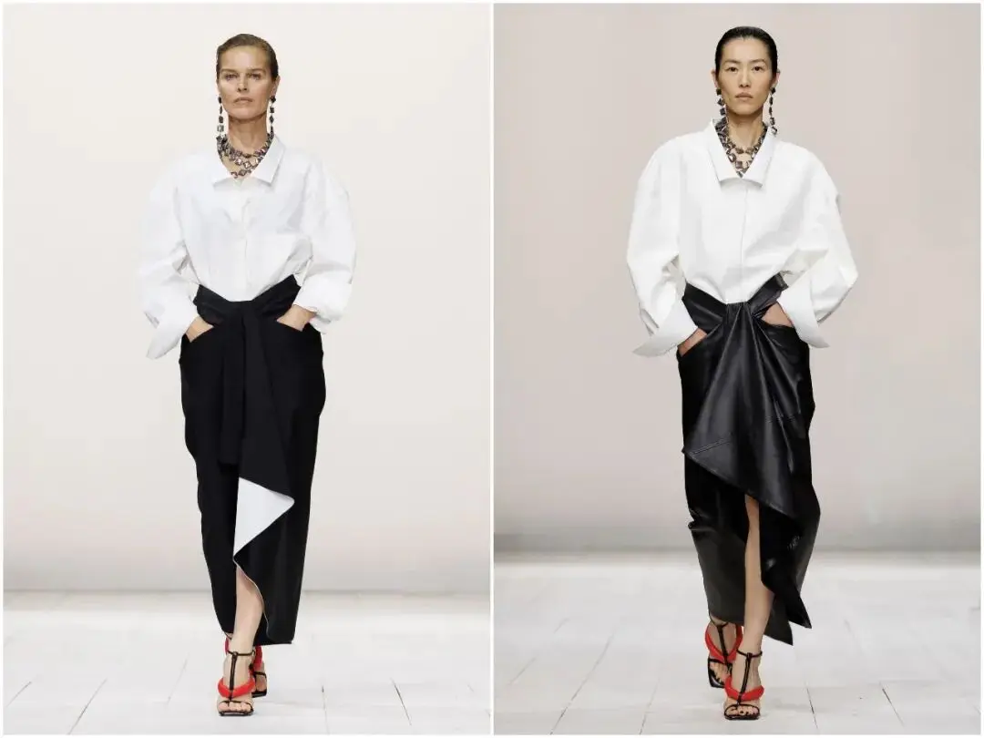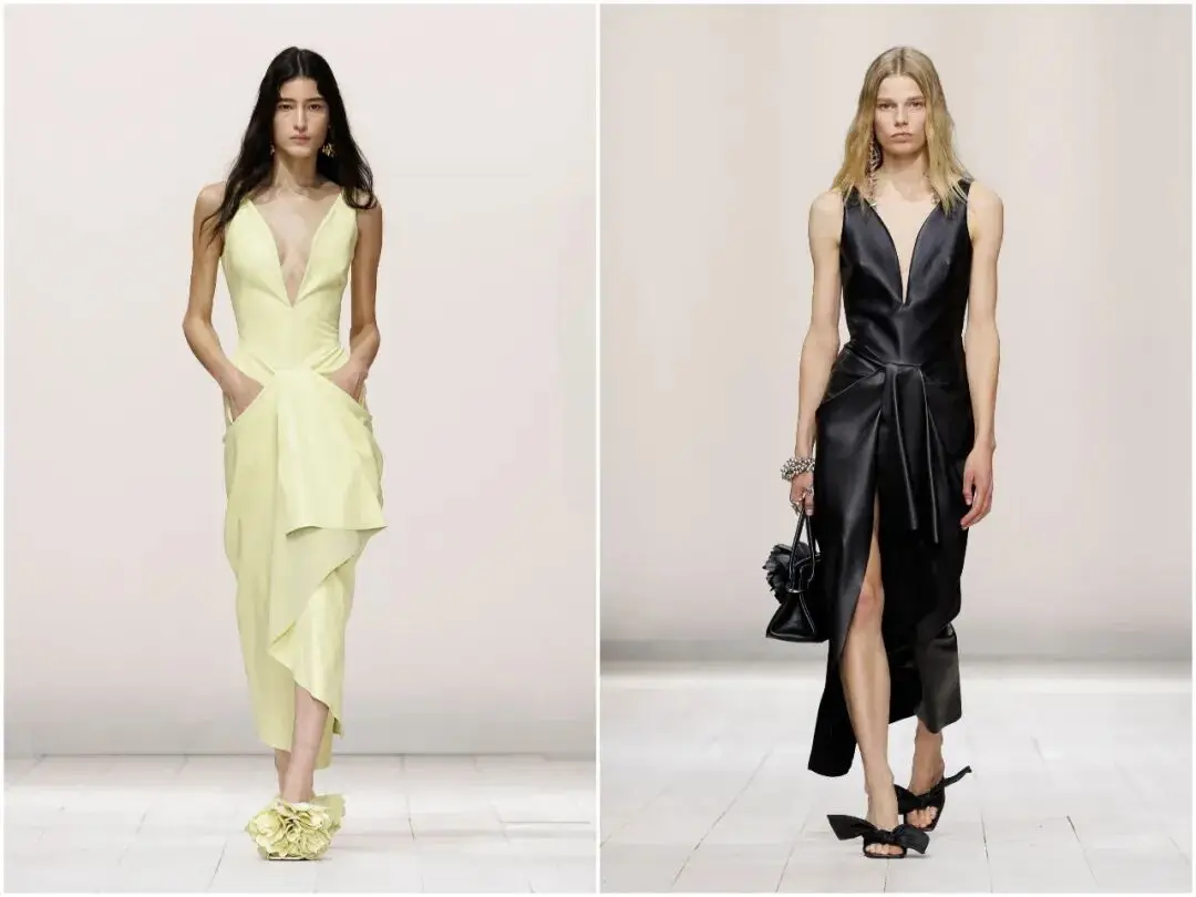 皮革运用是本季最大的惊喜之一,Sarah Burton用“以刚塑柔”的手法,颠覆了皮革的固有印象。看似柔软的白衬衫、垂坠感十足的半身裙,实则由细腻皮革打造;黄油黄皮革鸡尾酒裙,替代传统真丝缎面,挺括中带着丝滑光泽,让硬朗材质呈现出丝绸般的流动感,实现质感与美感的双重突破。
