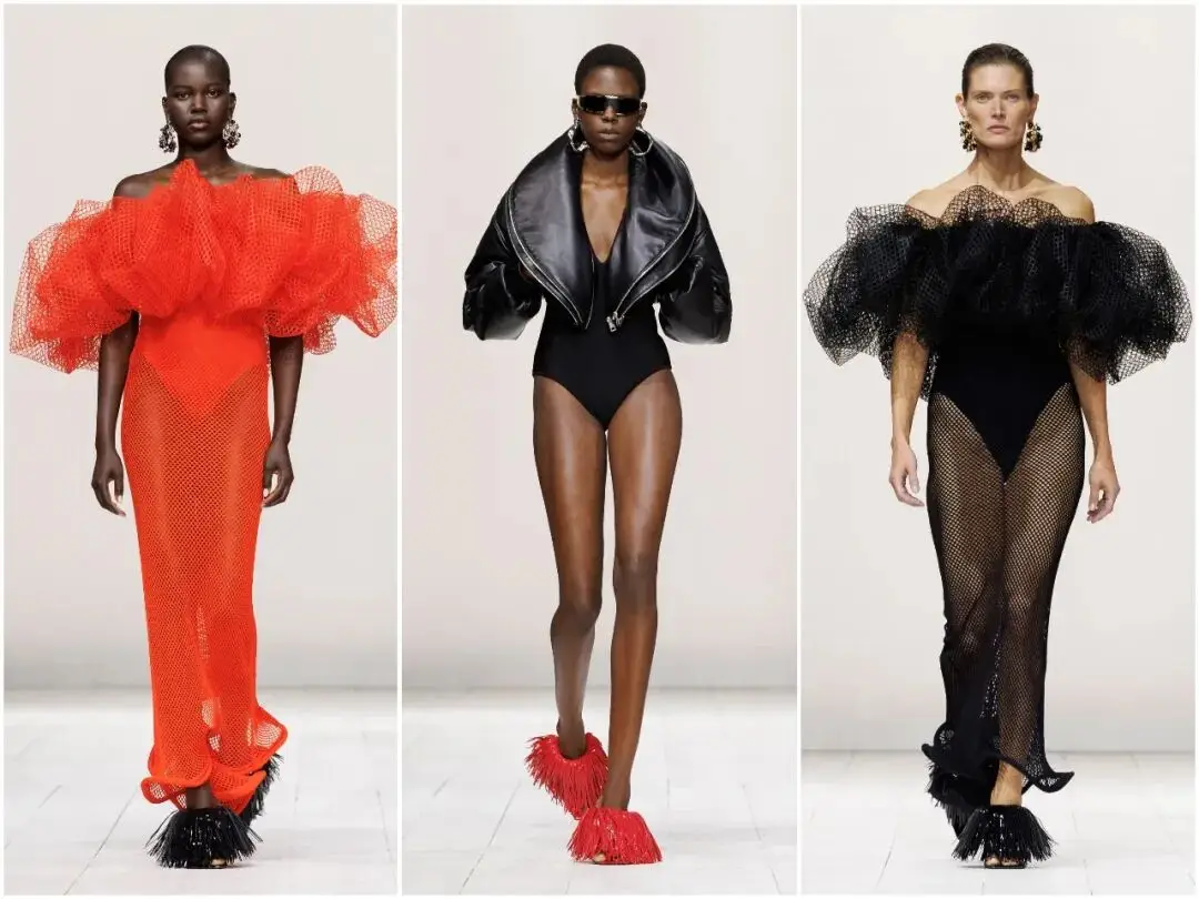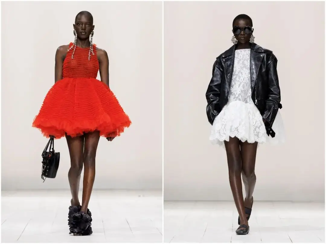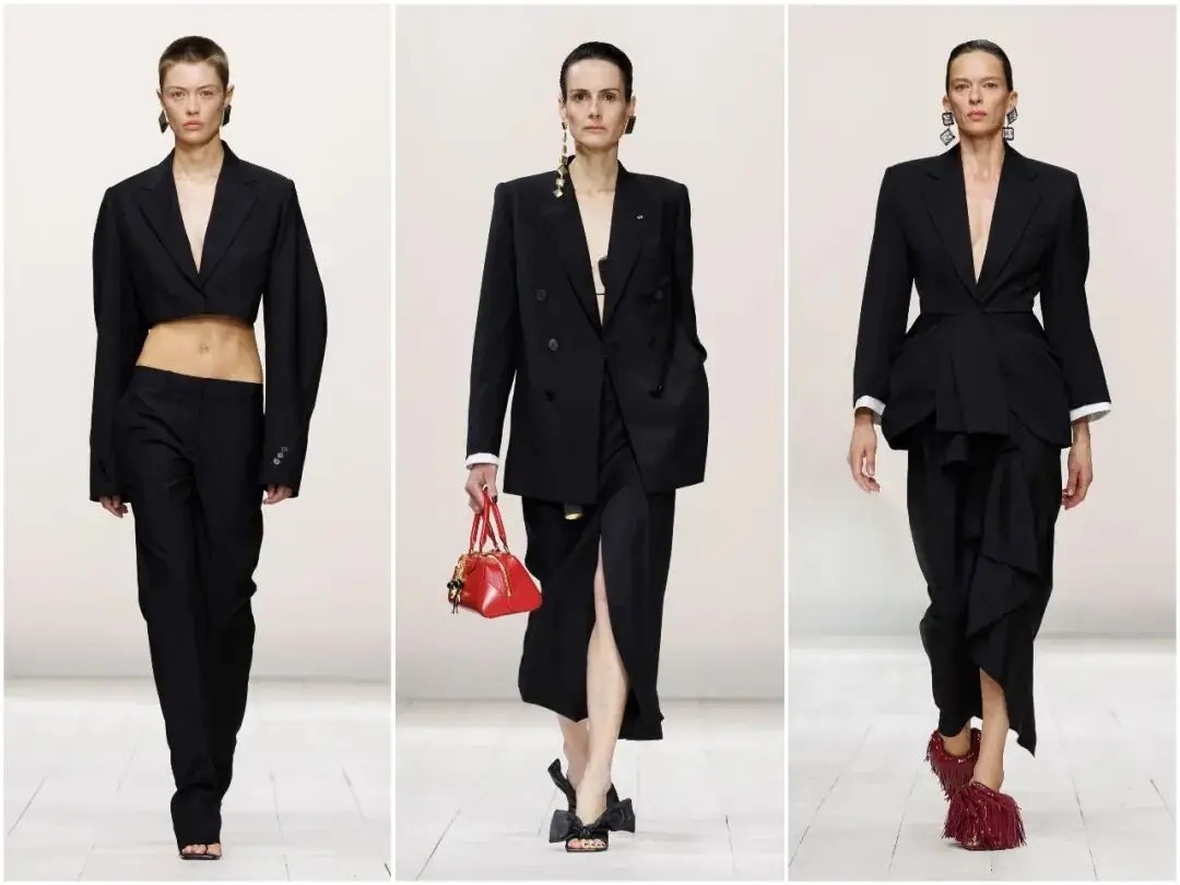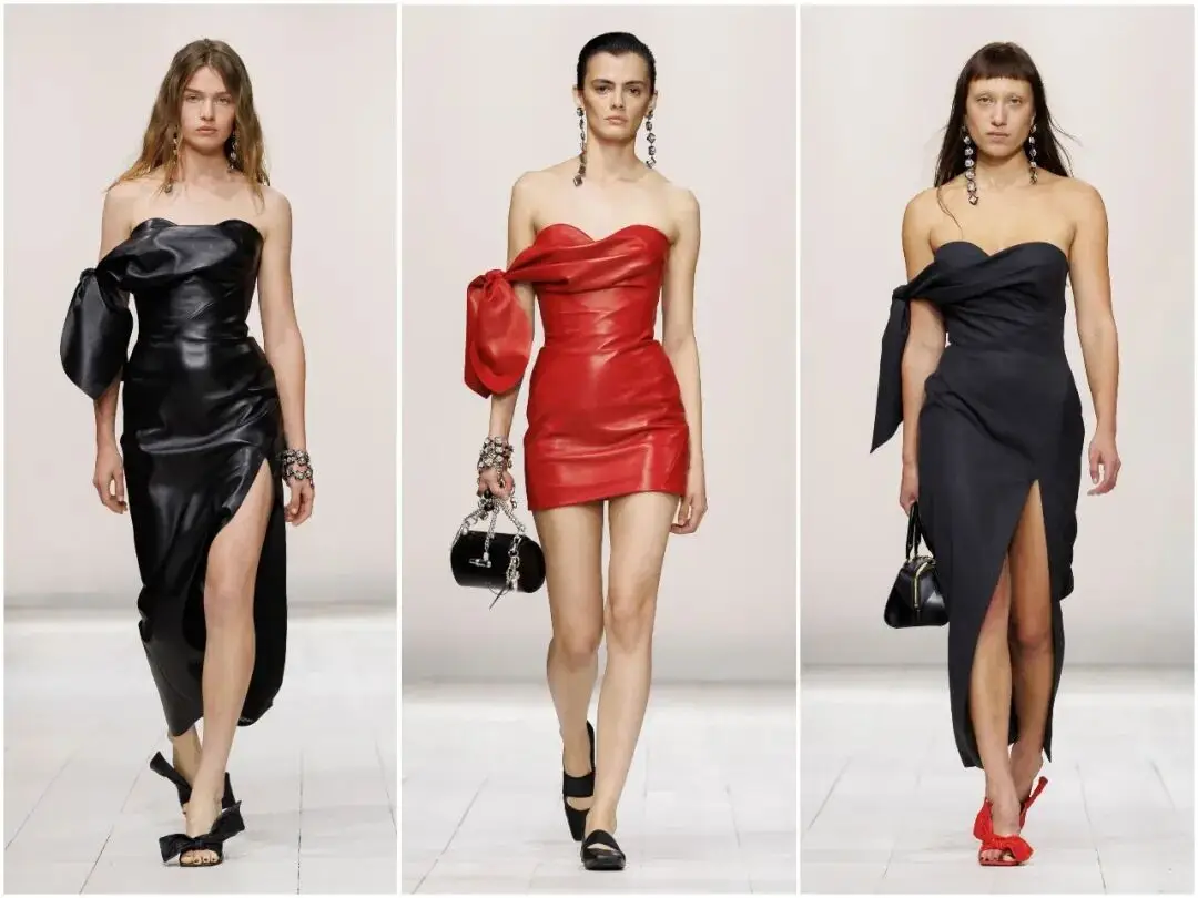 唇釉红是本季最具冲击力的色彩亮点,从针织迷你裙、皮革短款礼服,到配饰细节,这一抹热烈的红色贯穿始终。它不张扬、不俗气,象征着女性的自信与热情,与黑白的沉稳形成鲜明对比,成为秀场上最吸睛的视觉符号,也让春夏系列充满生机与活力。
