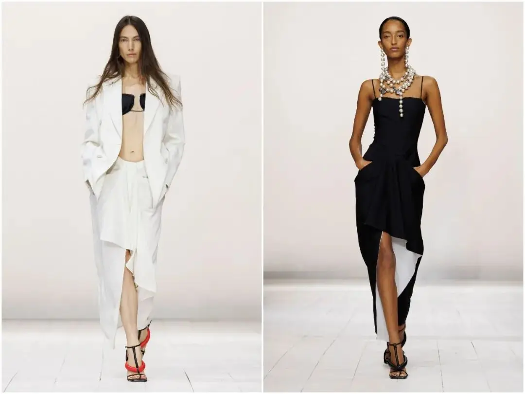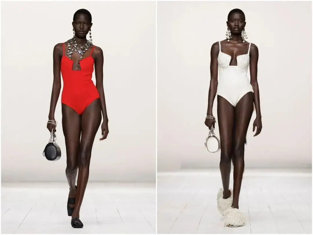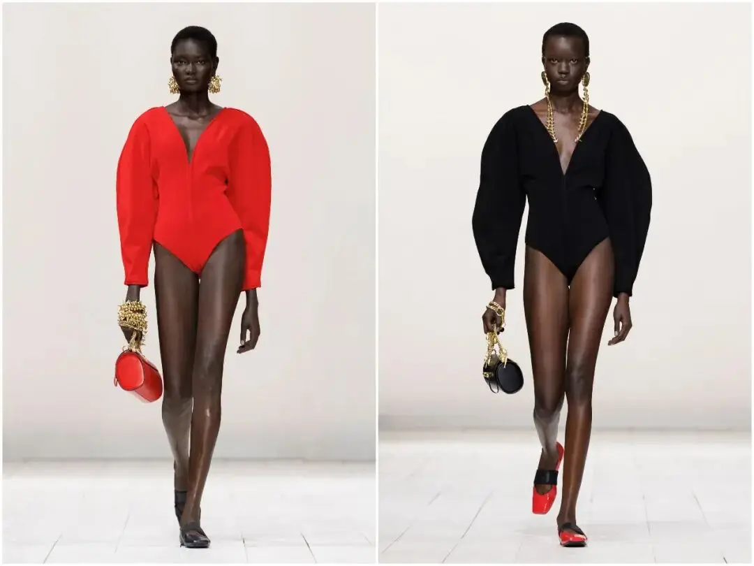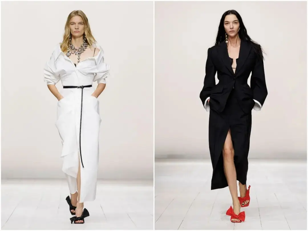 唇釉红是本季最具冲击力的色彩亮点,从针织迷你裙、皮革短款礼服,到配饰细节,这一抹热烈的红色贯穿始终。它不张扬、不俗气,象征着女性的自信与热情,与黑白的沉稳形成鲜明对比,成为秀场上最吸睛的视觉符号,也让春夏系列充满生机与活力。