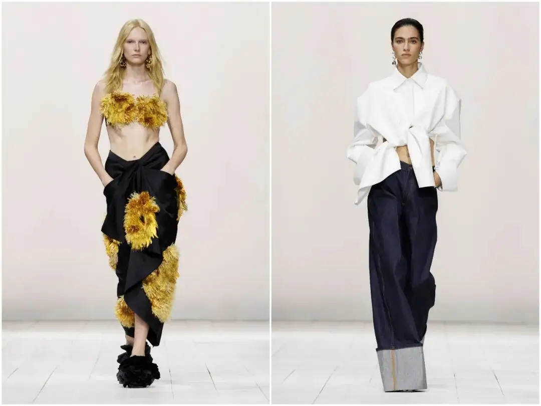 牛仔元素的加入,为纪梵希的高级感注入了街头活力。原色丹宁长裤保留毛边细节,搭配白色皮革衬衫、解构银色上衣,复古与前卫碰撞;紧身牛仔与结构感胸衣组合,昼夜交错的视觉效果,让休闲单品完美融入高定体系,打破奢侈与日常的壁垒,让纪梵希的美学更贴近生活。