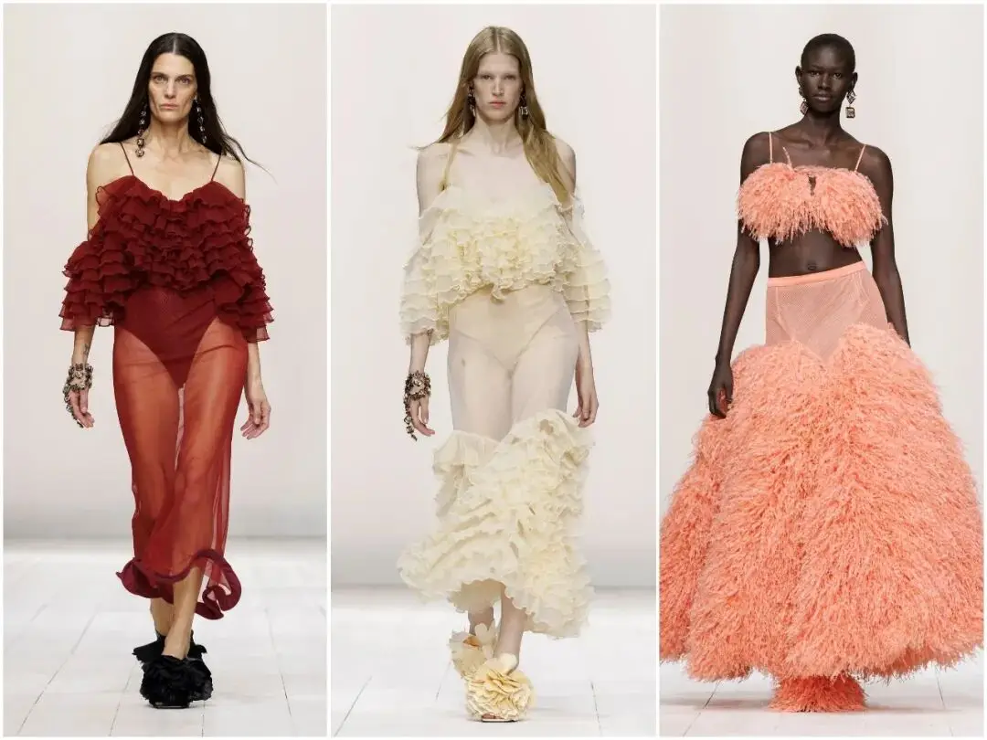 薄纱与蕾丝是女性气质的最佳载体,本季的工艺堪称高定级别。设计师将雪纺薄纱手工撕碎,模拟出羽毛般的轻盈效果,随风飘动时灵动飘逸;里昂蕾丝斗篷式连衣裙,搭配黑色细带,朦胧透视中藏着精致细节,不暴露、不刻意,用含蓄的方式展现女性的柔美与性感。