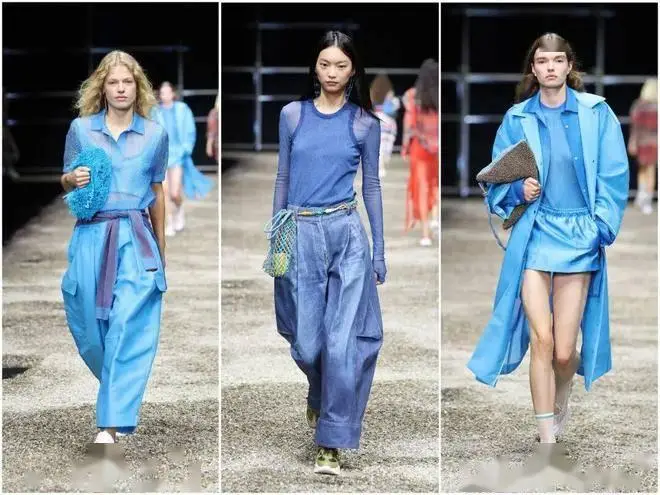 色彩是本季系列传递情绪的核心载体。设计师以柔和的象牙色、薄荷绿、蜜桃色为基底,如同春日清晨的薄雾,营造出温润松弛的基调。明亮的湖蓝、嫩黄与粉调穿插其间,为整体注入蓬勃的生机,而紫藤色、丁香色与紫罗兰色的加入,则让色彩层次更显深邃。贯穿整个系列的橙色尤为特别,它既是人类干预的象征,也承载着灾后重建的希望,让色彩拥有了超越视觉的叙事力量。