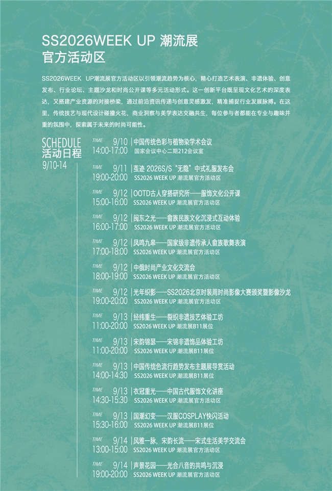 展期内还将举办“中俄时尚产业文化交流会”“茧迹2026S/S‘无隐’中式礼服发布会”“福建畲族文化展演”“非遗工坊”“服饰文化讲座”等一系列聚焦行业对话与沉浸体验的活动。“光年织影——SS2026北京时装周时尚影像大赛颁奖暨影像沙龙”及“声景花园——科技生态即兴演出”等跨界活动也将陆续呈现,持续拓展时尚与其他领域的互动张力。