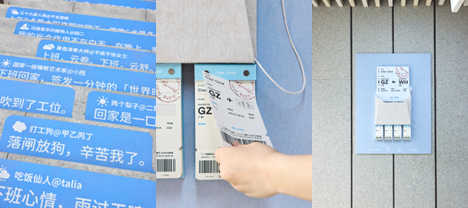 随着楼梯走下,一句句上班人心情语录就像用户弹幕,上班晴转多云,回家多云转晴的俏皮话带来情绪的会心一笑。步梯口旁则设置了一张立体信封海报,里面插着回家的船票。互动可撕的票根是给路人一张进入观看影展的门票。