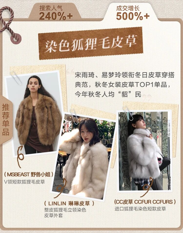 这届皮草风早从去年双11就开始蔓延。当时快手公布,它的皮草类产品成交额比24年同期增长44%,成交额破百万元的单品数量同比增长了114%。同样是在双11期间,京东皮草成交额增长翻倍,淘宝首周成交破亿、挤入前五的服饰品牌里,就有3家主营皮草的品牌。