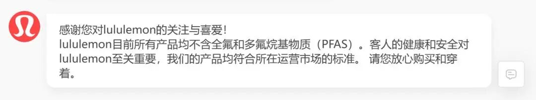 首先,Lululemon中国区只强调“国内在售产品不含PFAS”,却未提及“同一产地、不同市场产品的成分差异”,也未解释其供应链的差异化管控逻辑,导致消费者误以为“中国产品不含PFAS,是因为生产标准更高”,而忽略了“只是适配中国监管”这一核心前提。