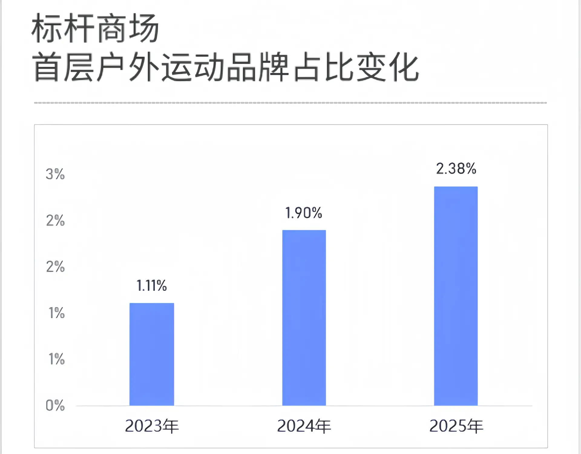 赢商大数据统计发现,相比2023年,2025年户外运动品牌在商场首层占比飙升114.35%至2.38%,成为继本土潮牌后又一热门品类,是中高档及高档商场新的引流神器。