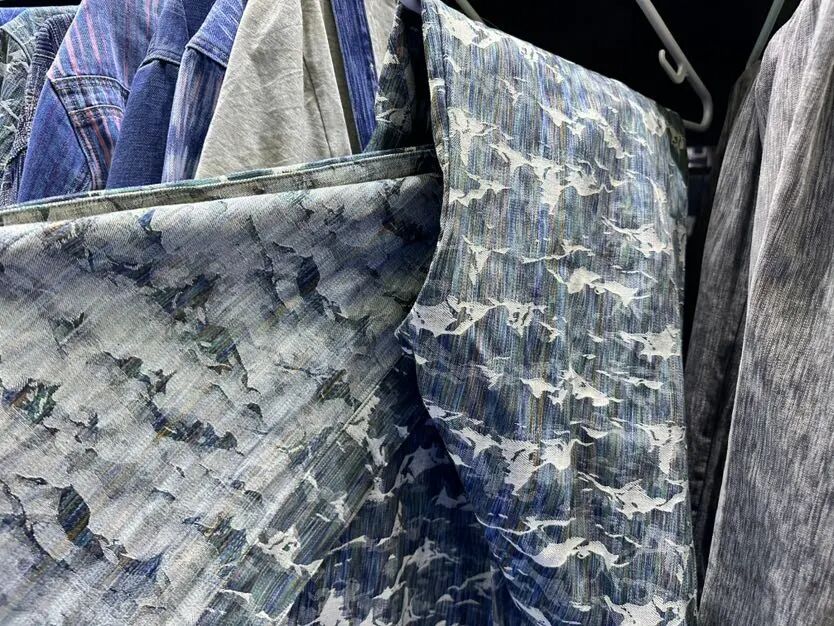 佛山市南海亿棉染织有限公司同样带来多款重磅新品。“我们展出春夏秋冬款牛仔西装套装,将植物染色与牛仔工艺结合,还有刚获‘中国印染面料优秀奖’的‘江山如此多娇’水墨风面料,以及数码科技、柳暗花明等专利花色产品,用创新打破传统牛仔的刻板印象。”