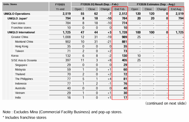 于线下,优衣库以开设旗舰店为核心,通过淘汰低效能门店等手段提升单店效率。截至2026年2月,优衣库大中华区门店较2025财年底减少19家至989家,中国内地门店减少21家至881家。